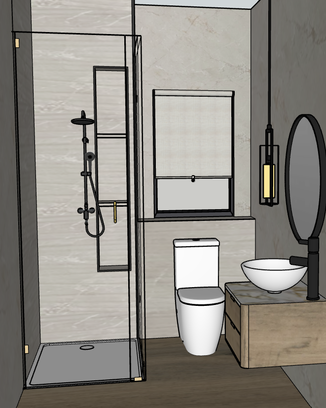 late afternoon light with drop pendant on and led strip light in the shower niches with a single flush spotlight over the shower and one over the toilet