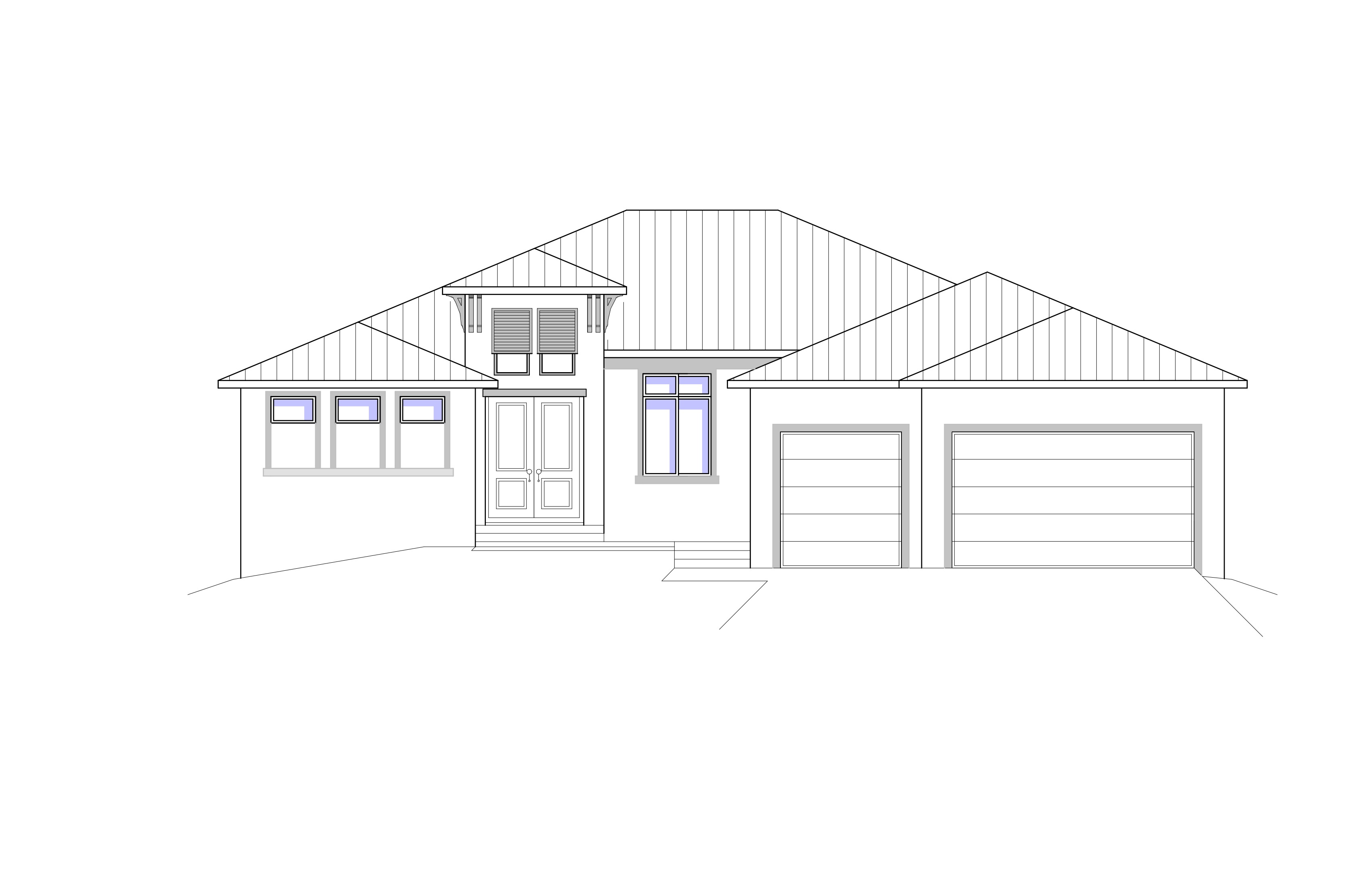 show a light grey standing seam metal roof dark grey corbels dark grey banding around windows and garage doors the short windows on the left side of home have smooth finish white stucco between the bottom of the windows and the 6 wide horizontal banding shown below there are 2 dark grey bahama shutters above the entry windows the entry doors are 2 panels each and painted dark grey the garage doors are light grey the base house is smooth finish stucco painted white dark grey dappled paver sidewalk with 4 steps terraced from entry doors sweeping wide to the garage tropical landscape with blue sky and fair weather clouds