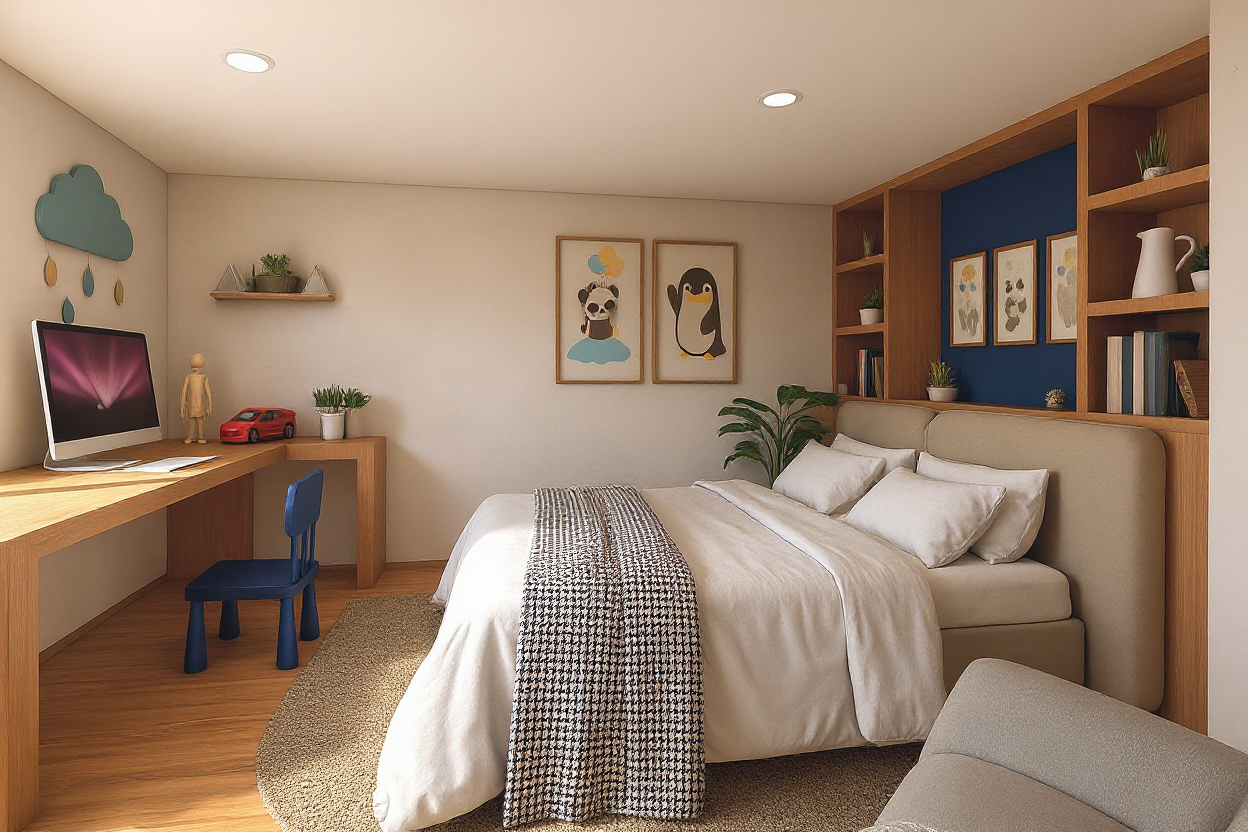 improve this bedroom render while keeping the existing furniture layout enhance textures walls fabrics wood flooring for a more realistic and high quality look add ceiling lighting plafon for a warm and cozy atmosphere include playful and age appropriate decorations suitable for a child s room such as cushions toys or wall art