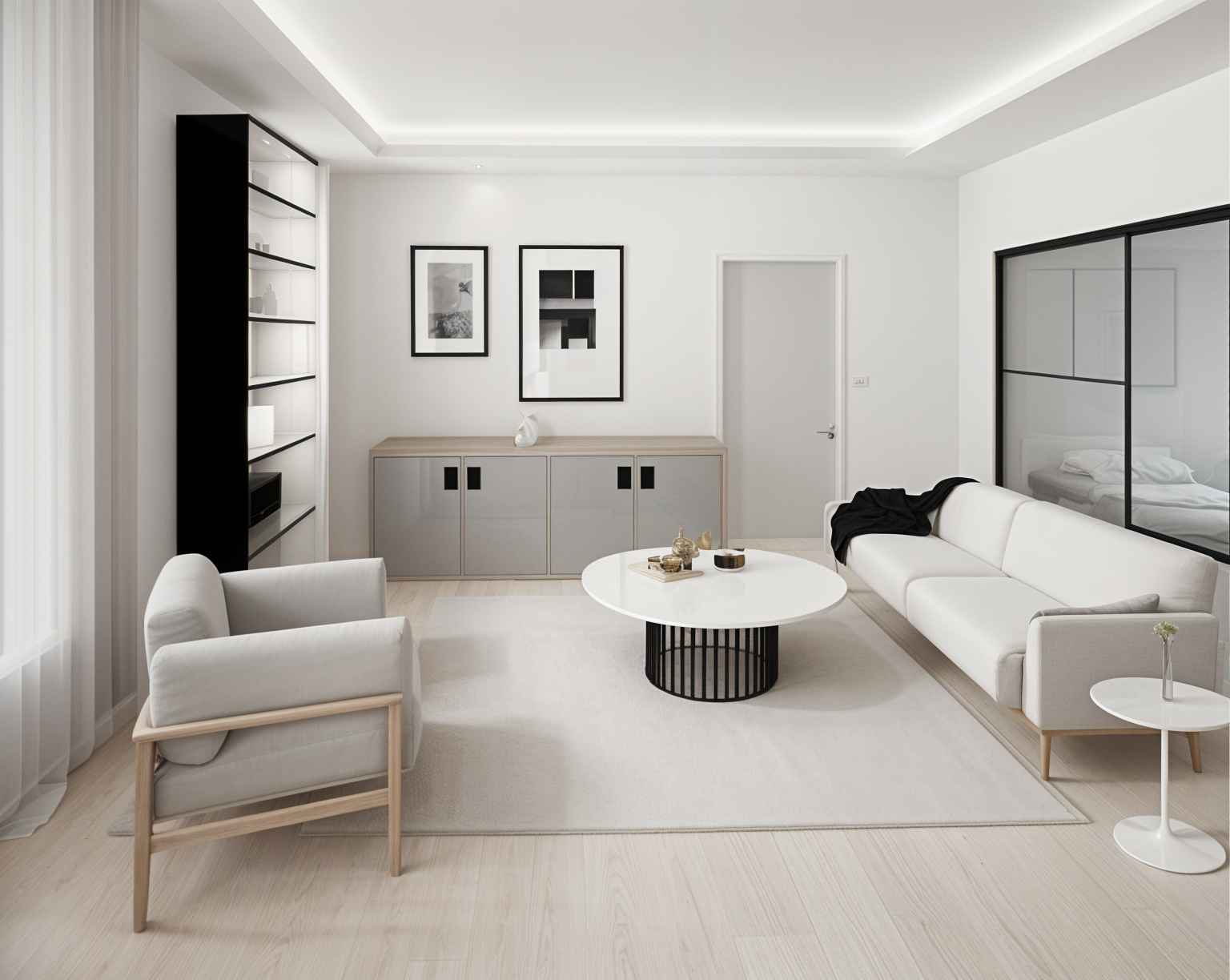 black walls doors and ceiling wood tray with cove lighting slope sofa in red velvet warm wood at floors and tray ceiling architecture