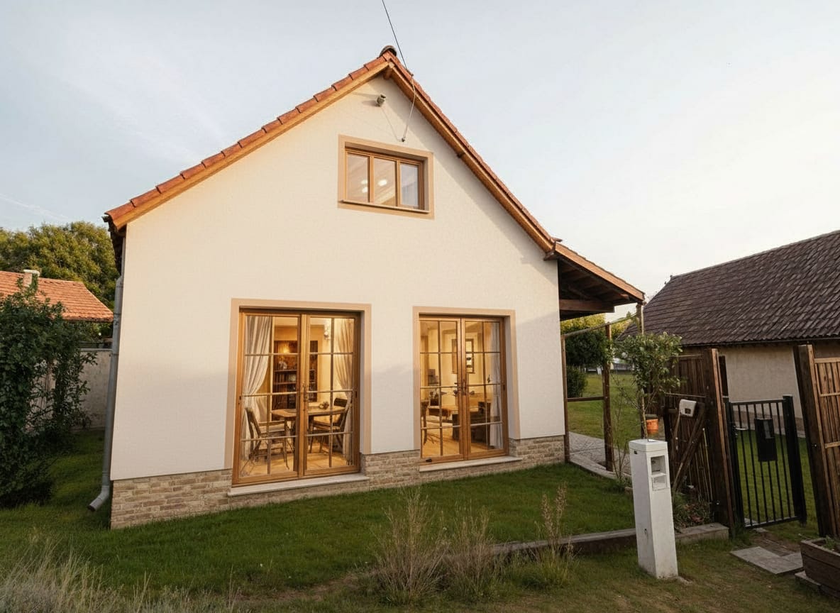 make second light brown frame around windows put curtains in put wooden terrace to front