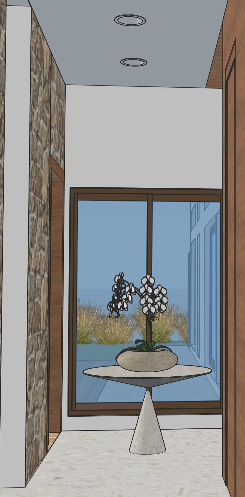 make it 4pm make the orchids white and make the view from the window a pool with an ocean view