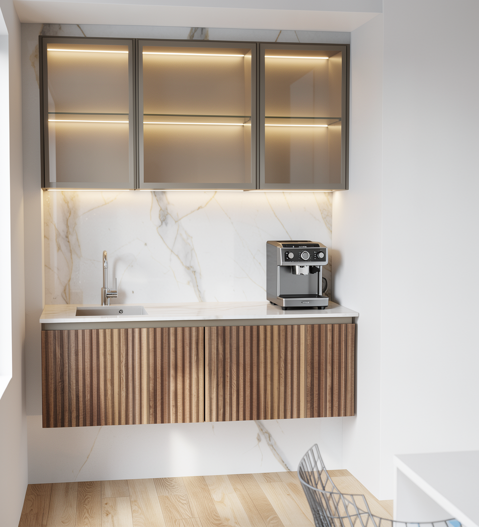 photorealistic render of a modern kitchen strictly preserving the original geometry layout proportions and exact colors visible in the reference image important keep all lacquered surfaces exactly the same color as in the original image without reinterpretation do not modify layout or proportions critical keep only one sink in the entire scene the original one on the main kitchen do not add any sink faucet or water element near the coffee machine the area under the glass cabinets must remain a dry countertop zone do not duplicate plumbing elements materials all lacquered units must keep the exact same matte color as shown in the image fluted canaletto walnut wood cannettato with horizontal grain and real 3d texture countertop and backsplash in laminam calacatta michelangelo glossy with controlled reflections floor in natural light oak parquet exactly as in the image glass cabinets smoked glass with internal warm led lighting 3000k soft and elegant illumination coffee machine place a de longhi coffee machine under the glass cabinets positioned on the countertop centered or slightly to the side no sink no tap no water connections near it lighting neutral daylight 4000k soft global illumination warm light only inside glass cabinets no color cast environment clean minimal no added elements realism ultra photorealistic accurate reflections and materials natural contrast and exposure camera same perspective 28 32mm lens straight vertical lines quality pbr ray tracing global illumination negative extra sink double sink additional faucet duplicated plumbing water tap near coffee machine added basin layout modification no lavello solo coffe machine