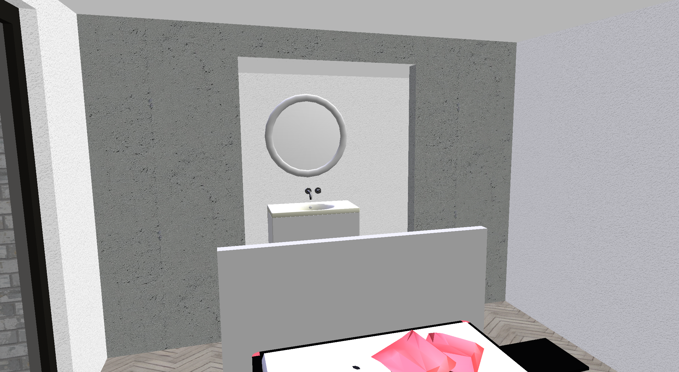 genau dieses rendering berarbeiten fotorealistisches innenraum foto exakt dieselbe perspektive und kameraposition wie das hochgeladene referenzbild 100 identische raumgeometrie exakt gleiche m belanordnung weiches nat rliches tageslicht raum k nstlich ausleuchten sanfte realistische schatten realistische materialien stoff mit leichten gebrauchsspuren hochwertige oberfl chenreflexionen lavabo komplett aus marmor collemandina grigio in braungrau dunkel lavabo innen ebenfalls collemandina im unterbau im obersten drittel eine griffmulde ber die ganze breite ganzer unterbau in collemandina unterbaum bel mit unterbaubeleuchtung dahinter eine gessi wandarmatur edelstahl vollkommen rahmenloser und hinterleuchteter spiegel mit echten spiegelungen alle sichtbaren w nde sind sichtbeton schwarze steckdose rechts vom lavabo auf gleicher h he wie die armaturen schwarze runde deckenspots im bad und im zimmer bett modern mit kopfteil aus beigem abgesteptem leder sehr moderner minimalistischer look nat rliche farbwiedergabe golden hour feeling hell ausleuchten das bild muss wie eine professionelle fotografie aussehen es soll ein echtes und reales foto sein canon eos r5 35 mm festbrennweite f 2 8 hyperrealistisch dslr qualit t raw aufnahme 8k aufl sung extrem scharf perfekte tiefensch rfe professionelle architekturfotografie