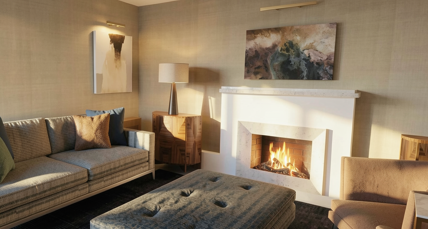 add trees in background add fire in fireplace