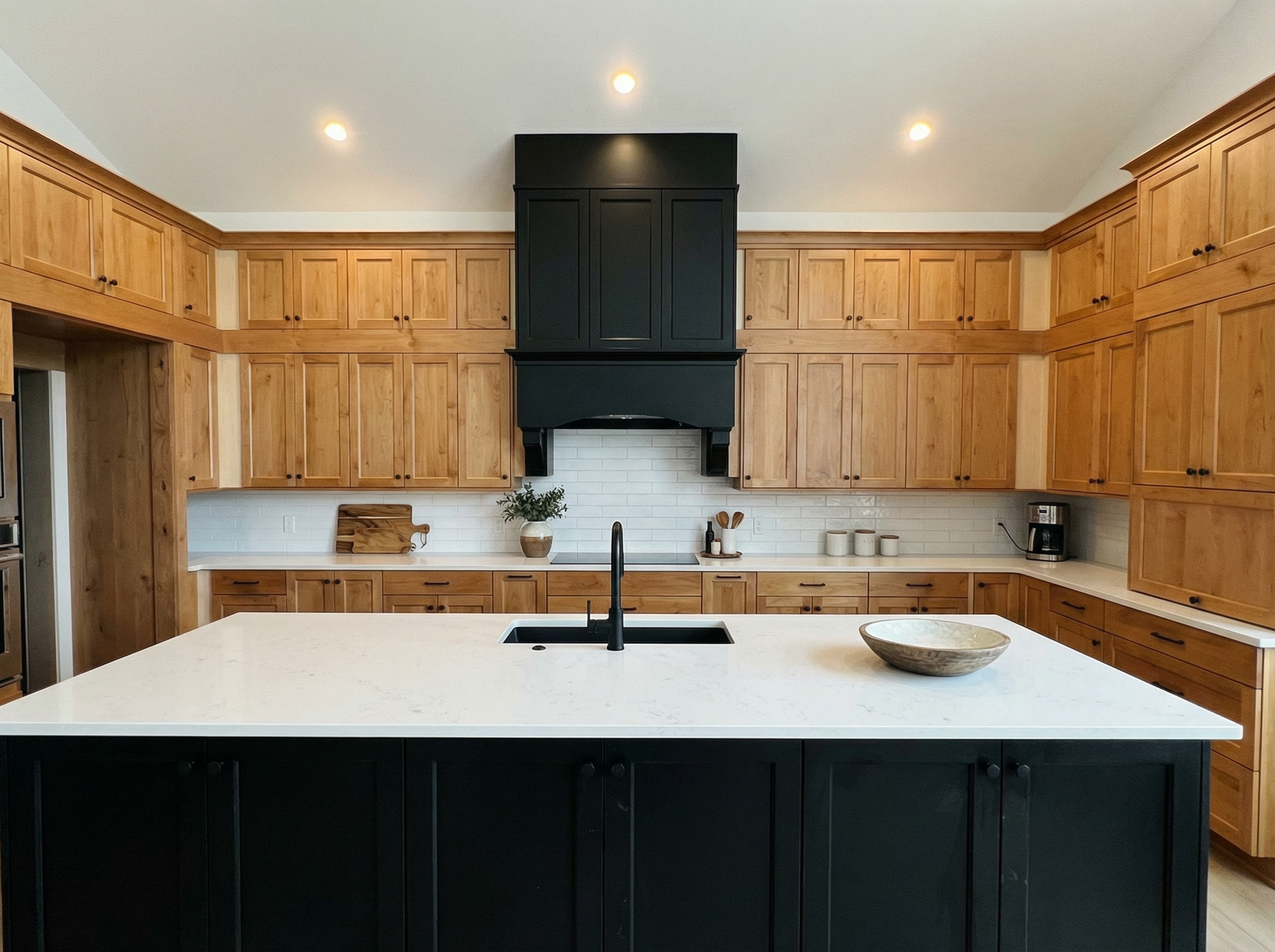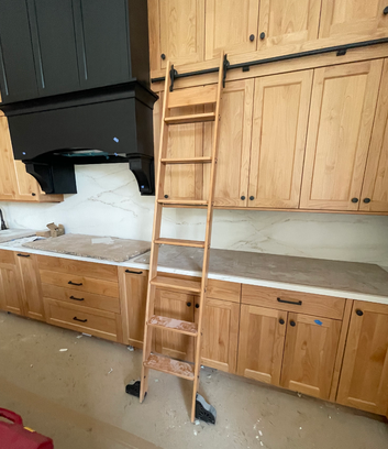 do not change the cabinets in any way preserve the exact cabinet colors materials finishes dimensions door and drawer styles hardware spacing alignment and all geometry exactly as shown do not alter the countertop shape backsplash appliances flooring lighting fixtures or wall structure only remove the construction materials clutter and mess from the scene clean the room and make it look finished and staged add a few simple tasteful home accessories appropriate for the style of the space but do not add or remove any furniture windows or architectural elements maintain the original lighting direction and realism enhance clarity and polish the photo while keeping the cabinetry and room design completely unchanged do not alter the lighting to keep the cabinet colors as they are in the image add white countertops stage for a kitchen