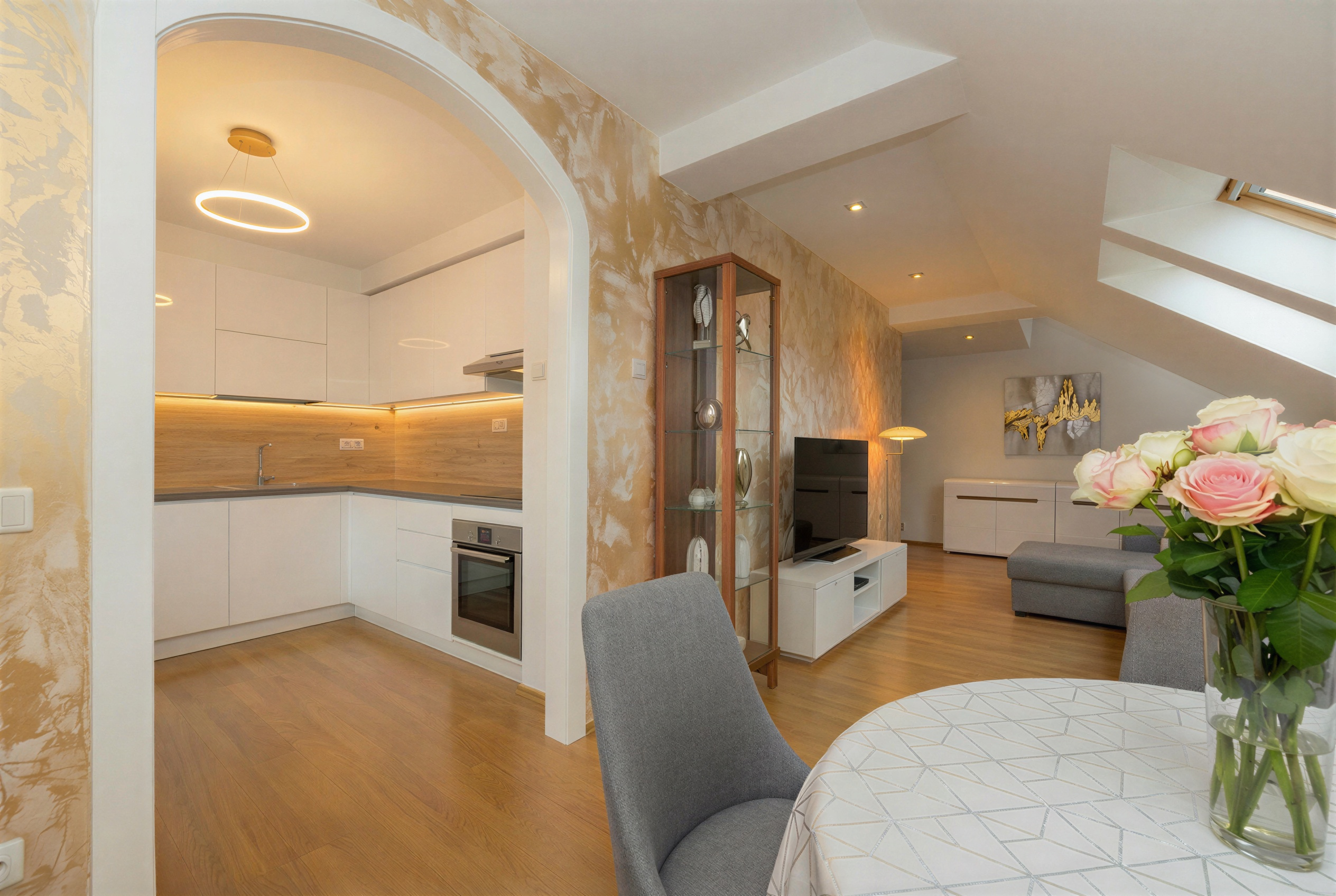 vykresli l pe sv tlo v zadn sti m stnosti zm barvu dekoru na ubruse na zlatav st b it zlatavou na ist b l m podkladu c lem je pr miov realitn prezentace