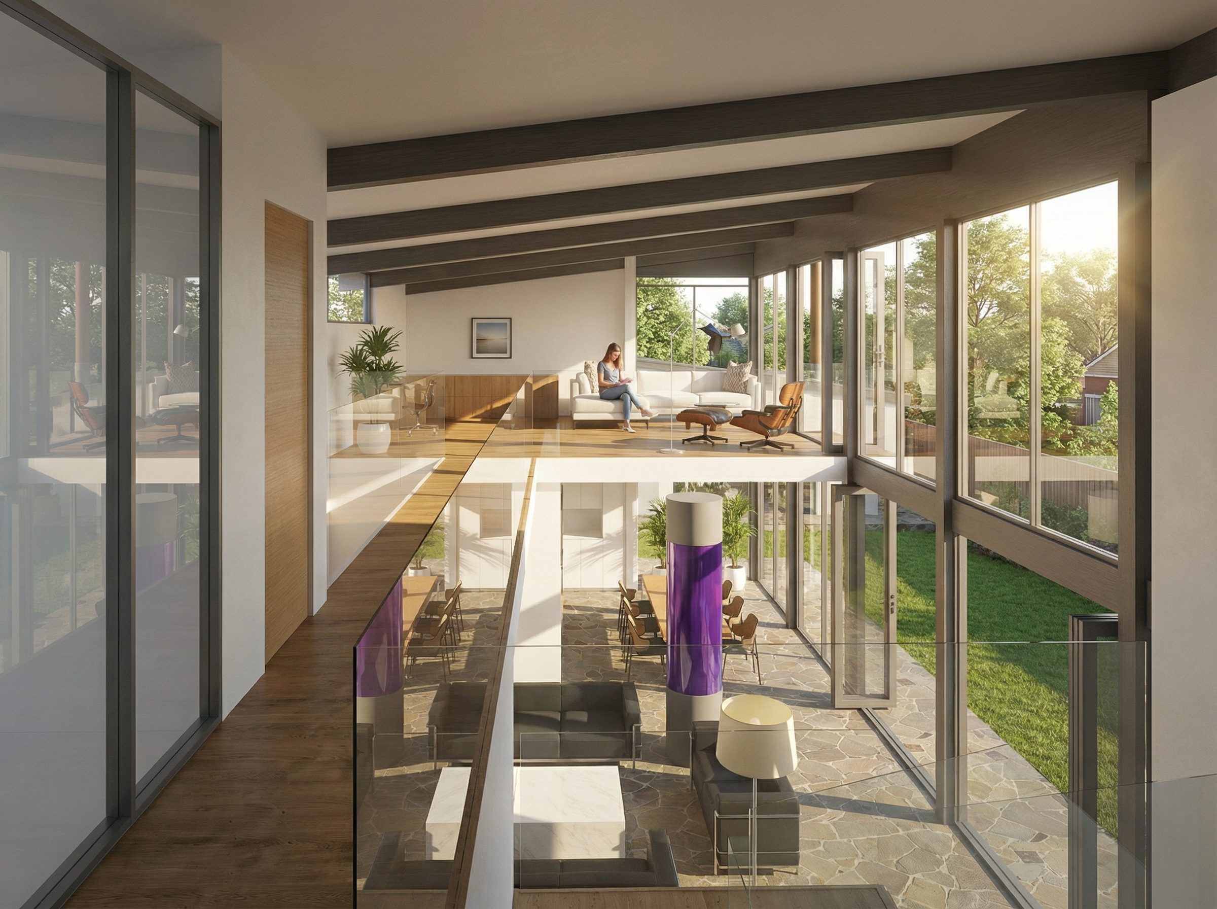 neo classical home square profile column slate roofing solid garage door on the left side facing the street wet road photorealistic render sunny day raytracing