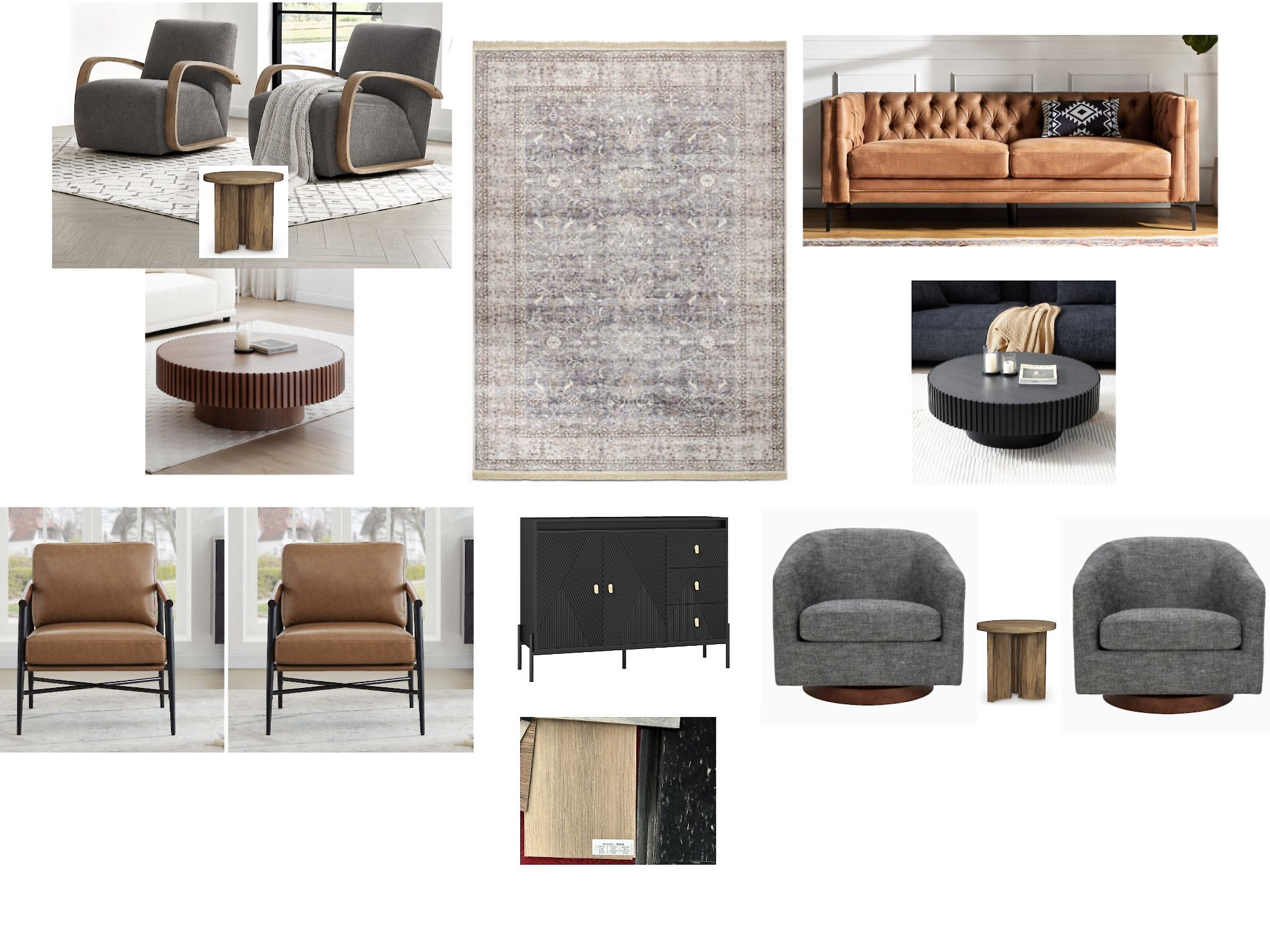 modernist interior shot create an interior room space using the items pictured in this moodboard use the oak floor sample for the flooring and seperate two seating groupings with rugs under each maintain the colors that are used in the mood board architecture