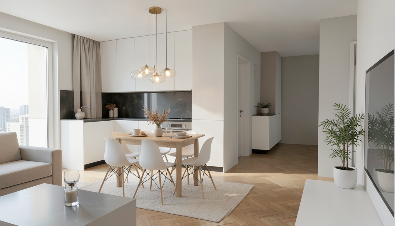 cinematic 3d interior render pov from a mountain house hallway looking through a geometric opening in a light white laminate entryway cabinet foreground a wooden entryway bench matching the parquet floor topped with a thick cushion in raw textured forest green fabric middle ground a matching wooden coffee table aligned with the bench background a cozy living room with a large sofa in melange brown and orange fabric left wall full height continuous wooden boiserie integrating tv unit open niches and cabinets wrapping onto the ceiling flooring wide plank rustic wood parquet right wall plain white natural alpine light high end mountain chalet interior design hyper realistic textures 8k