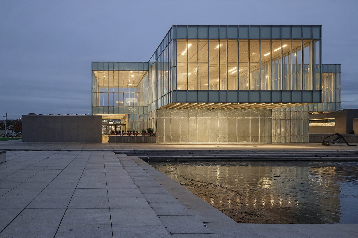 apply greenery along the building vine like adjust atmosphere to be a mildly overcast day add people and kids to the plaza to add occupancy of the space