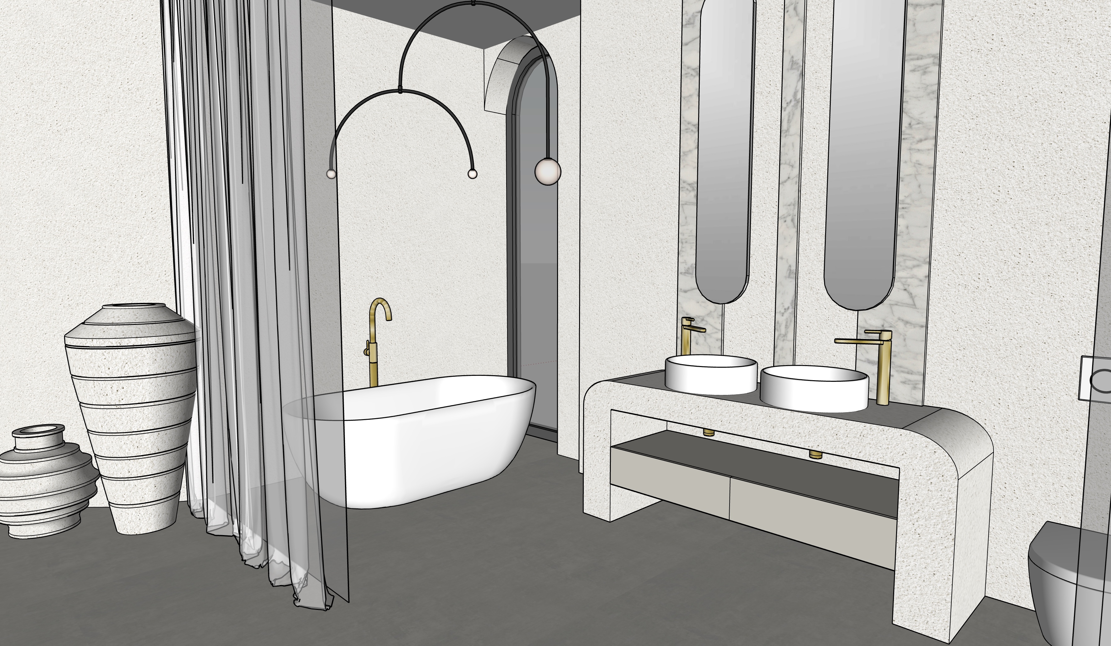 add small recessed lights in the ceiling 4000k add dimmed led light under the shelves floor and walls is light micro concrete window is translucent white