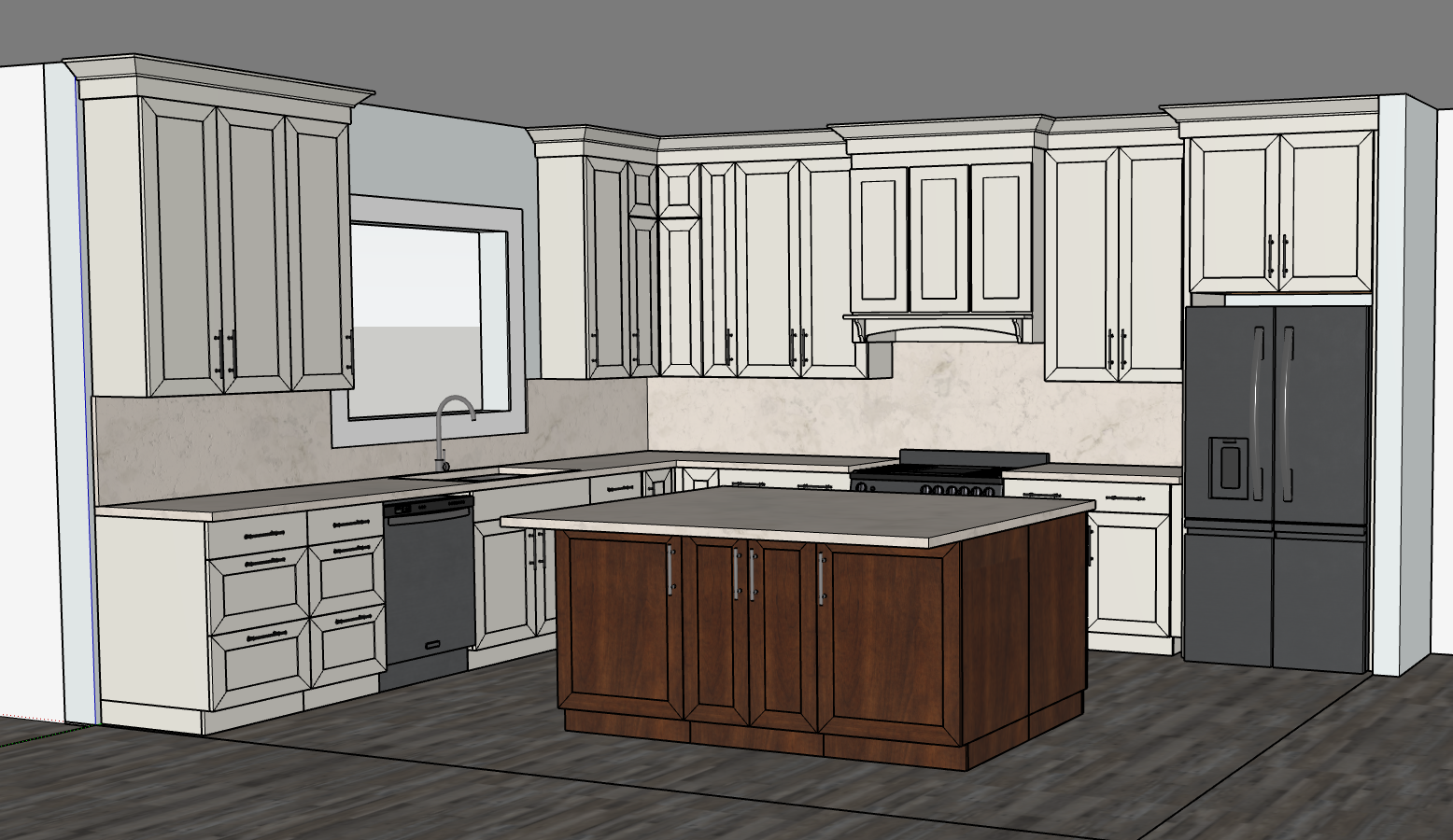 this is a beautiful kitchen with soft white painted cabinets on the walls accented by a dark alder stained island all the white cabinets have matt black handles and the island cabinets have brushed nickel handles the counter tops and backsplash is a beautiful white marble the floors are a beautiful modern hardwood there s lots of natural light coming in through the window over the sink