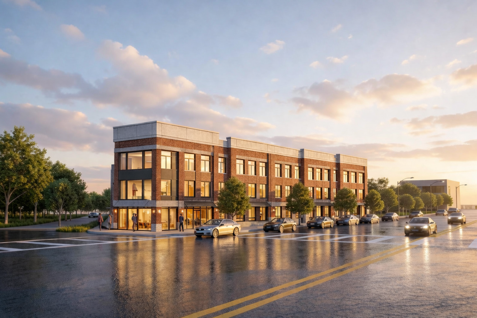 add some signage at the left small face of the building above the first floor windows that says stadium cafe to indicate a small cafe at that area