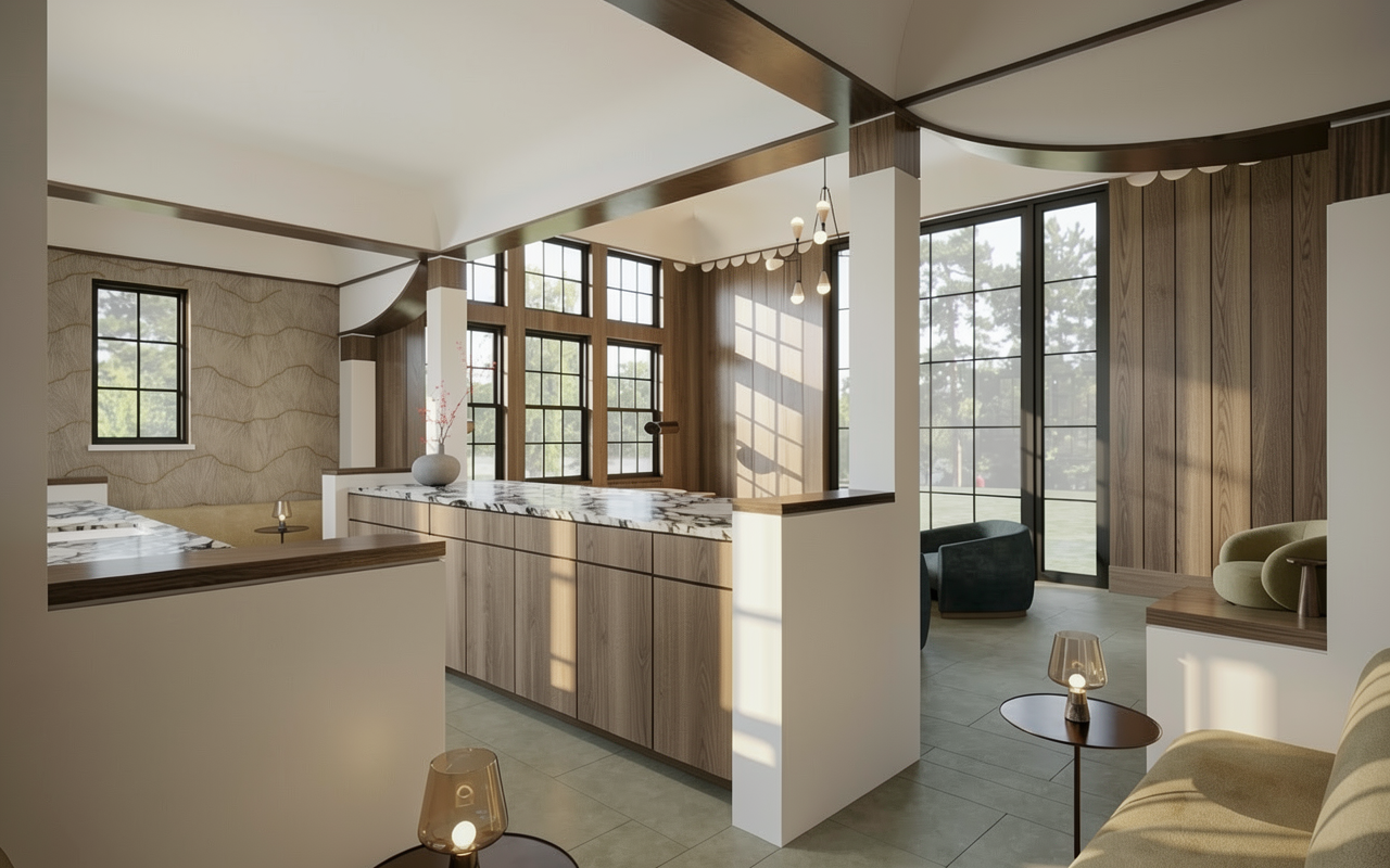 change the wood in the space to a darker ebony stain only the existing wood not the wallpaper walls or the metal trim