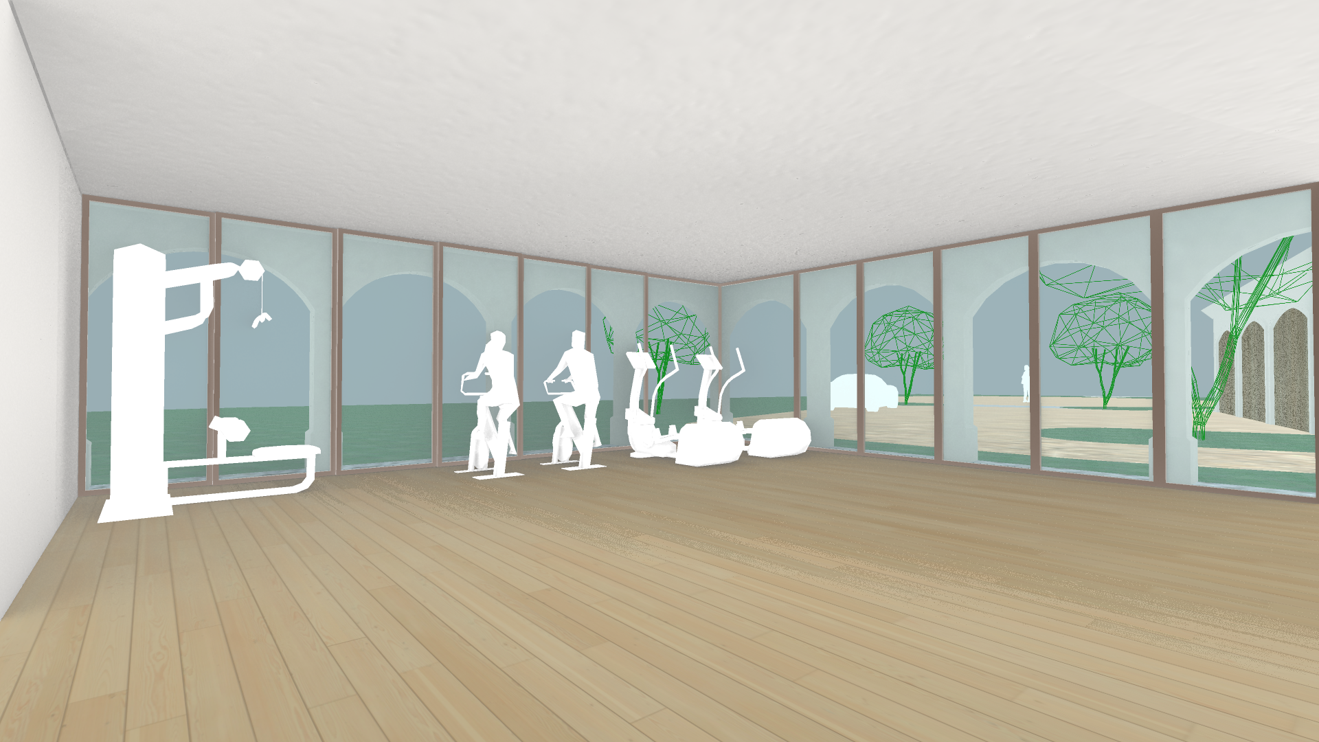 create a photorealistic high quality interior render of a luxury home gym timber floors bronze aluminium glass windows cream plaster looking out on a lush mediterranean garden of lavender and long grasses turn the green wire frame trees into real trees do not change the view or geometry