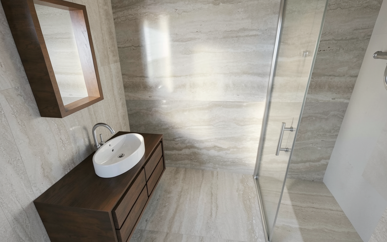 golden hour sunlight positioned behind the camera shining directly onto the facade short soft shadows under balconies and window frames no side shadows warm frontal sunlight with controlled highlights realistic architectural lighting physically accurate shadow direction consistent sun angle balanced exposure no blown highlights no glare no lens flare