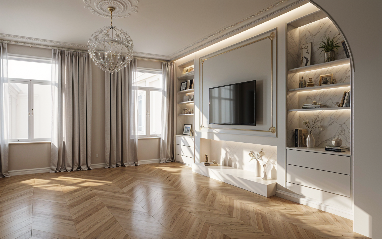 render a modern living room interior with a minimalist design creating a warm and inviting atmosphere the bench base is from wood and pillows of cotton beige fabric the floor is a sleek gray adding a contemporary feel fashion the chairs with a blend of dark metal legs and light gray upholstery the lighting is soft and ambient casting gentle shadows enhancing a cozy and elegant ambiance remove the light