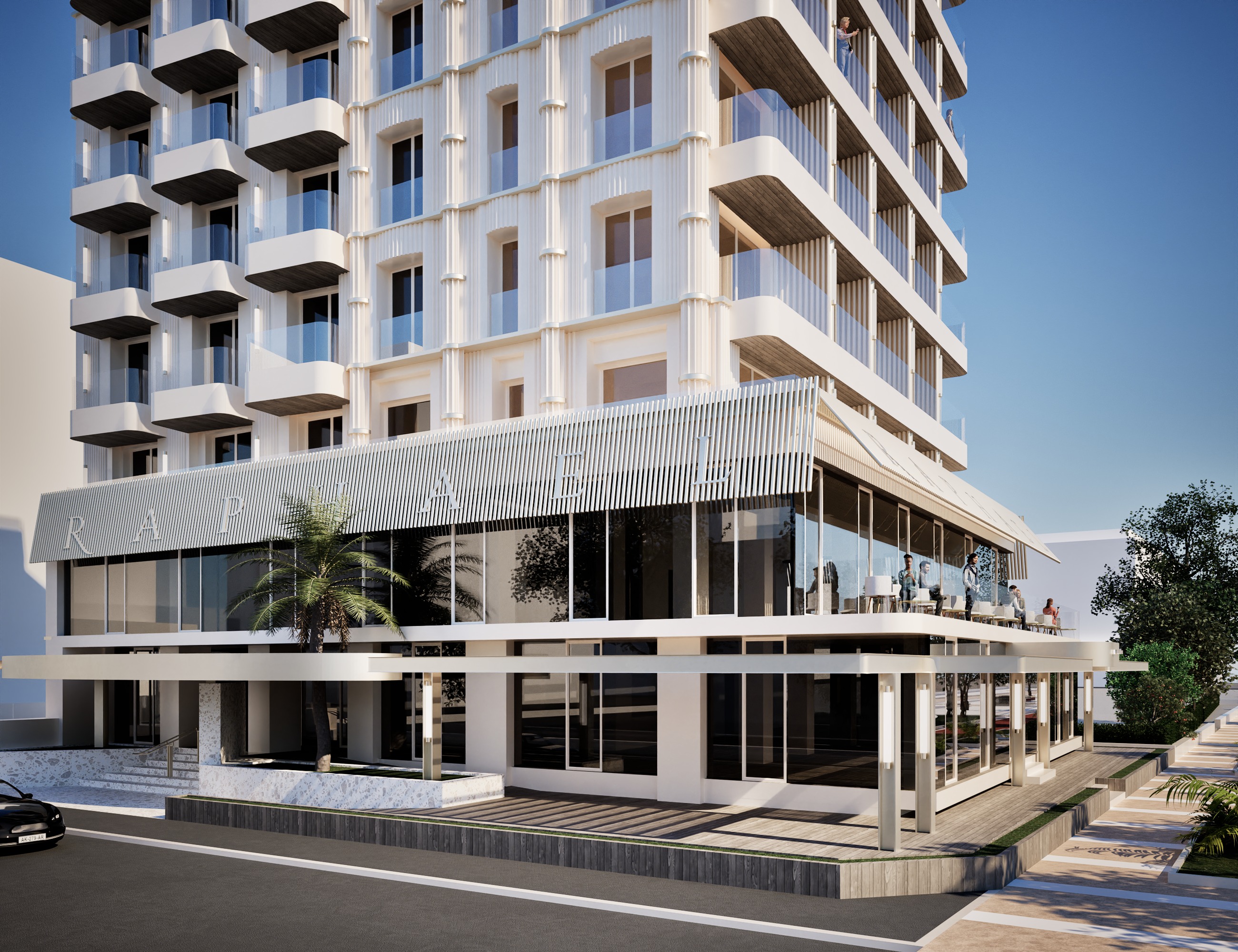 aggiungi le persone aggiungi il verde nelle fioriere e sopra la pensilina rotonda sopra l ingresso aggiungi tavolini e divani da area lounge sulla pedana in legno a destra metti delle tende alle vetrate