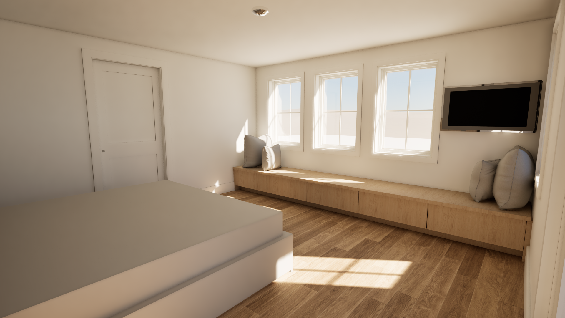 modern bedroom with a bench with cushion