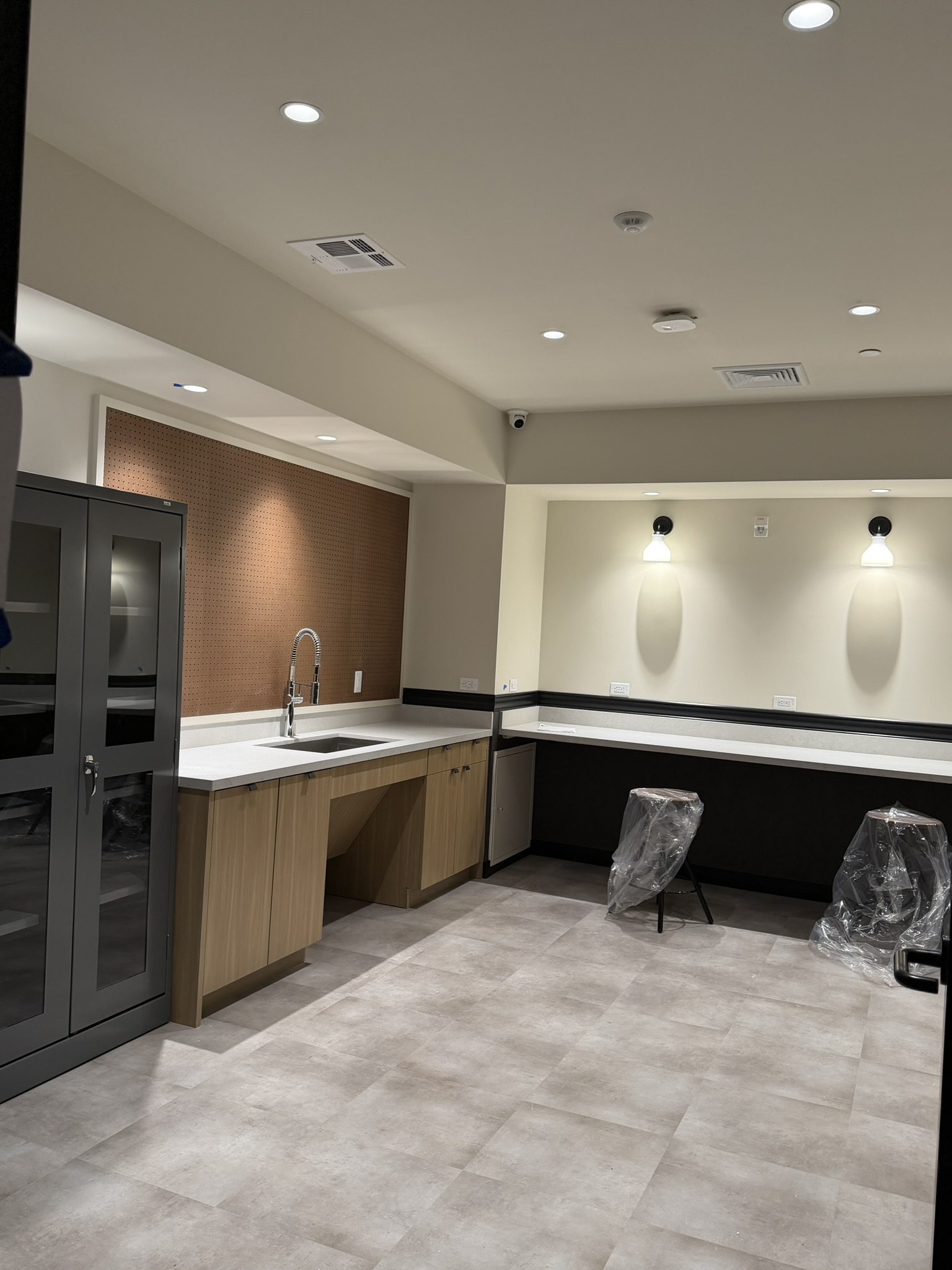 decorate the room as a craft room add decorative tools and items to peg wall on left behind sink add wall art under sconces and painting supplied to countertop remove plastic wrap on stools