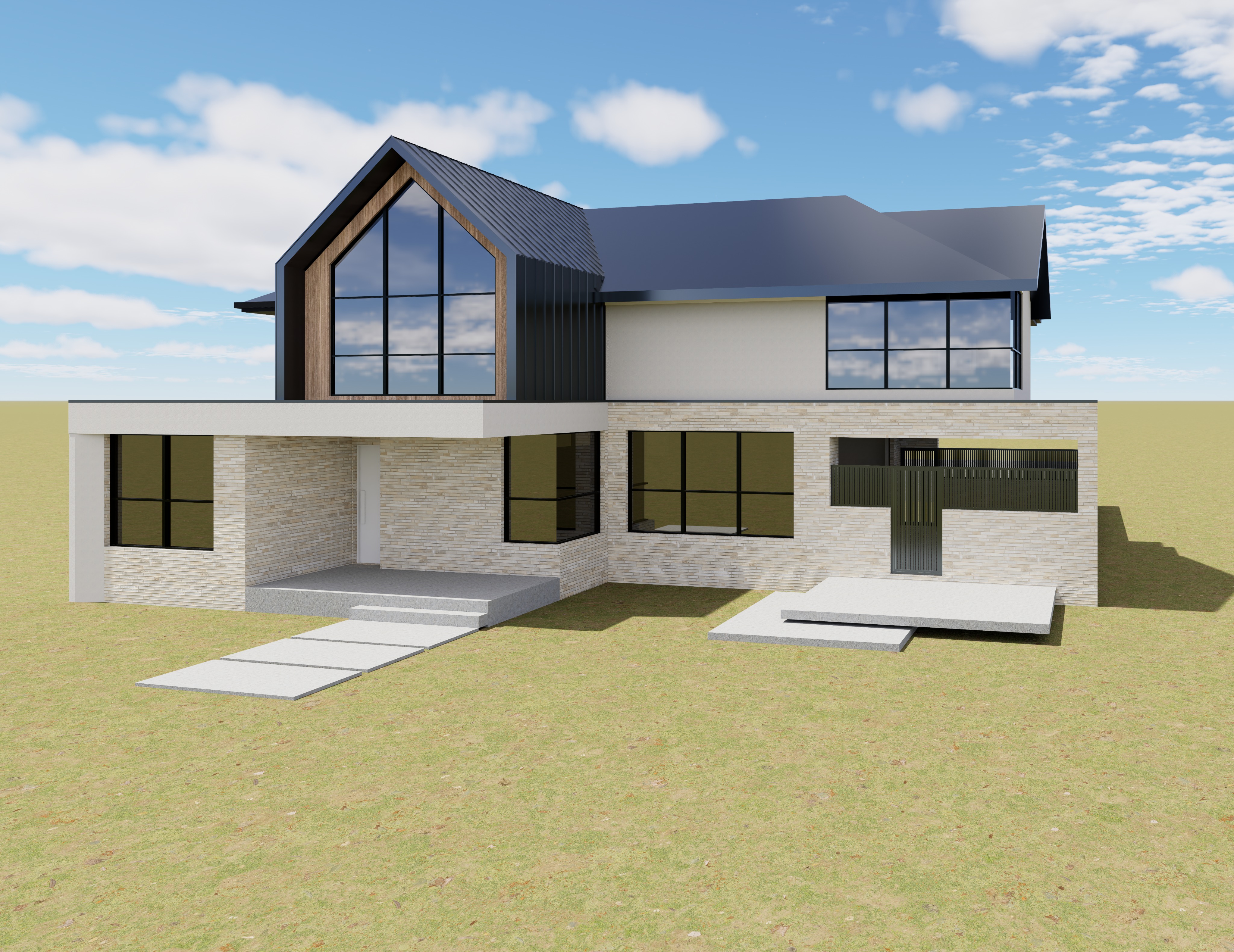 photorealistic architectural render of this house roof and upper gable wall cladding colorbond architectural standing seam cladding in monument black keep the form exactly as shown just apply the monument finish consistently all white wall areas serrano soft nude smooth render finish all brickwork kraus warm ghost brick with realistic texture and mortar joints concrete paving modern realistic concrete paving with natural tone and subtle texture enhance material sharpness and realism add tasteful residential landscaping soft lawn low shrubs native plants and subtle greenery that complements the house and ties everything together natural daylight realistic shadows clean modern residential vibe maintain material colours as they are in image do not change window types