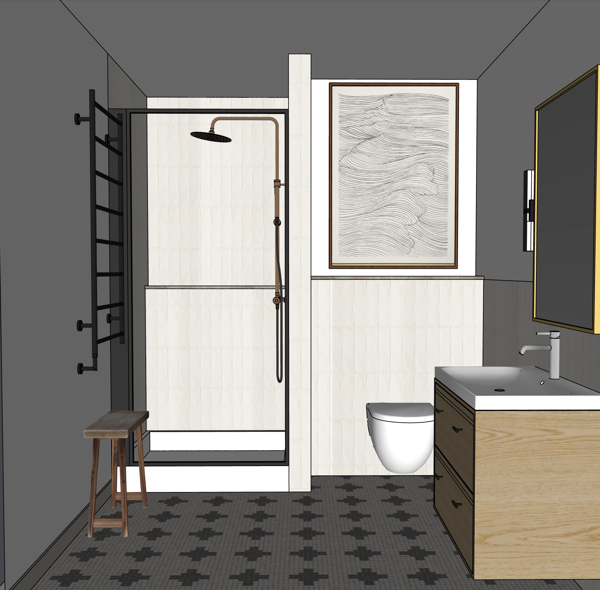 light and airy bathroom with glossy warm white tile clean and crisp with wood accents