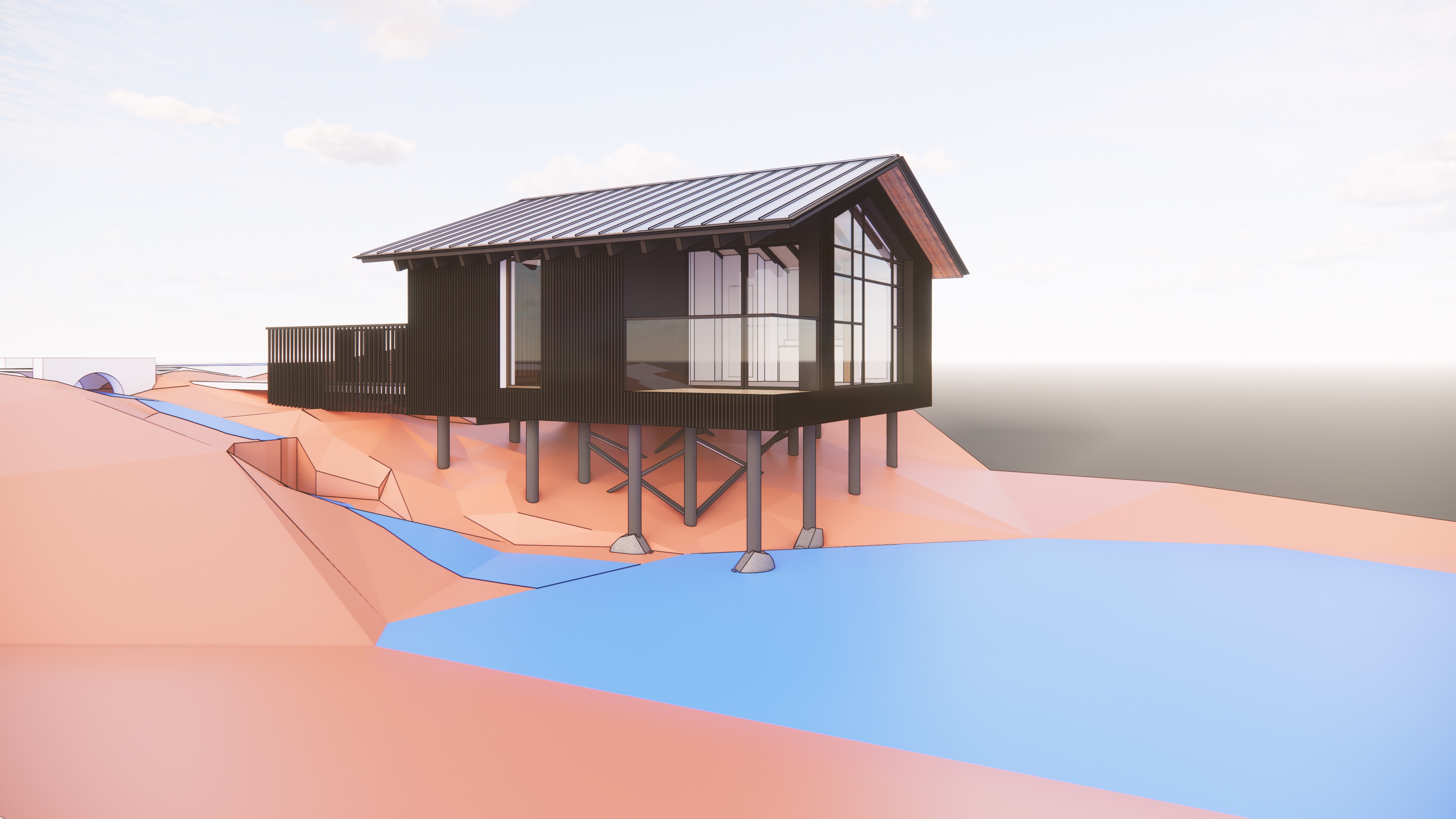 maintain the light to see the details under the roof wal material black burned wood posts ground of a deciduos forest pond roof is pigmento brown the house is partly over the lake