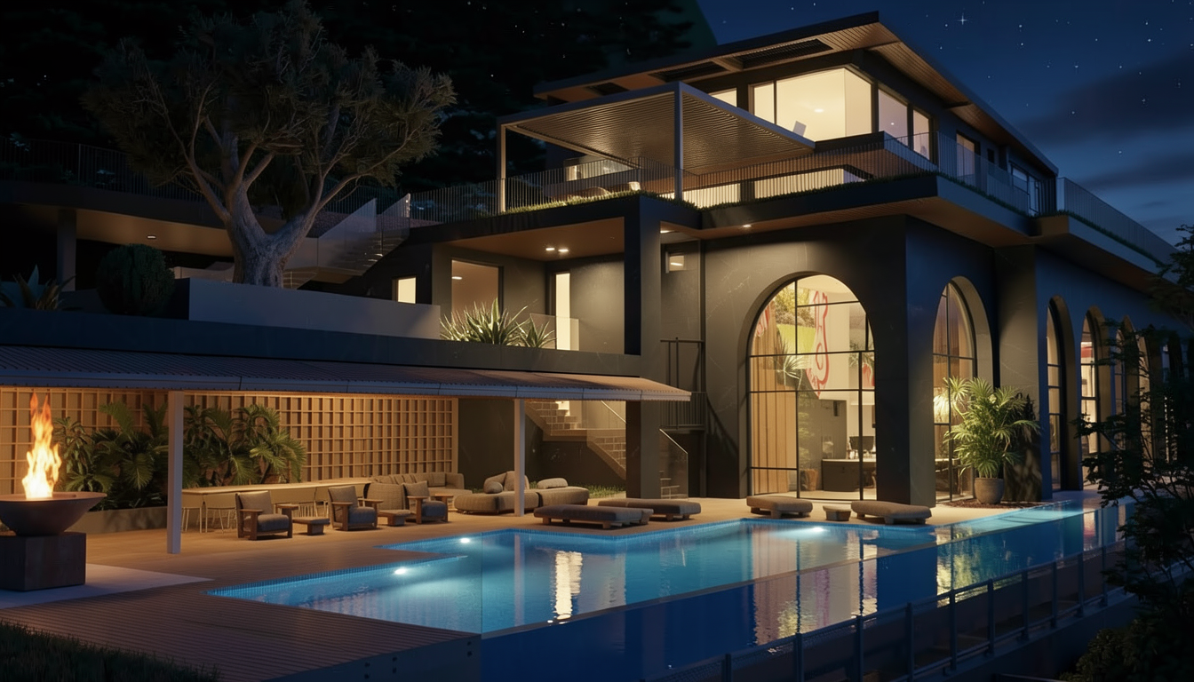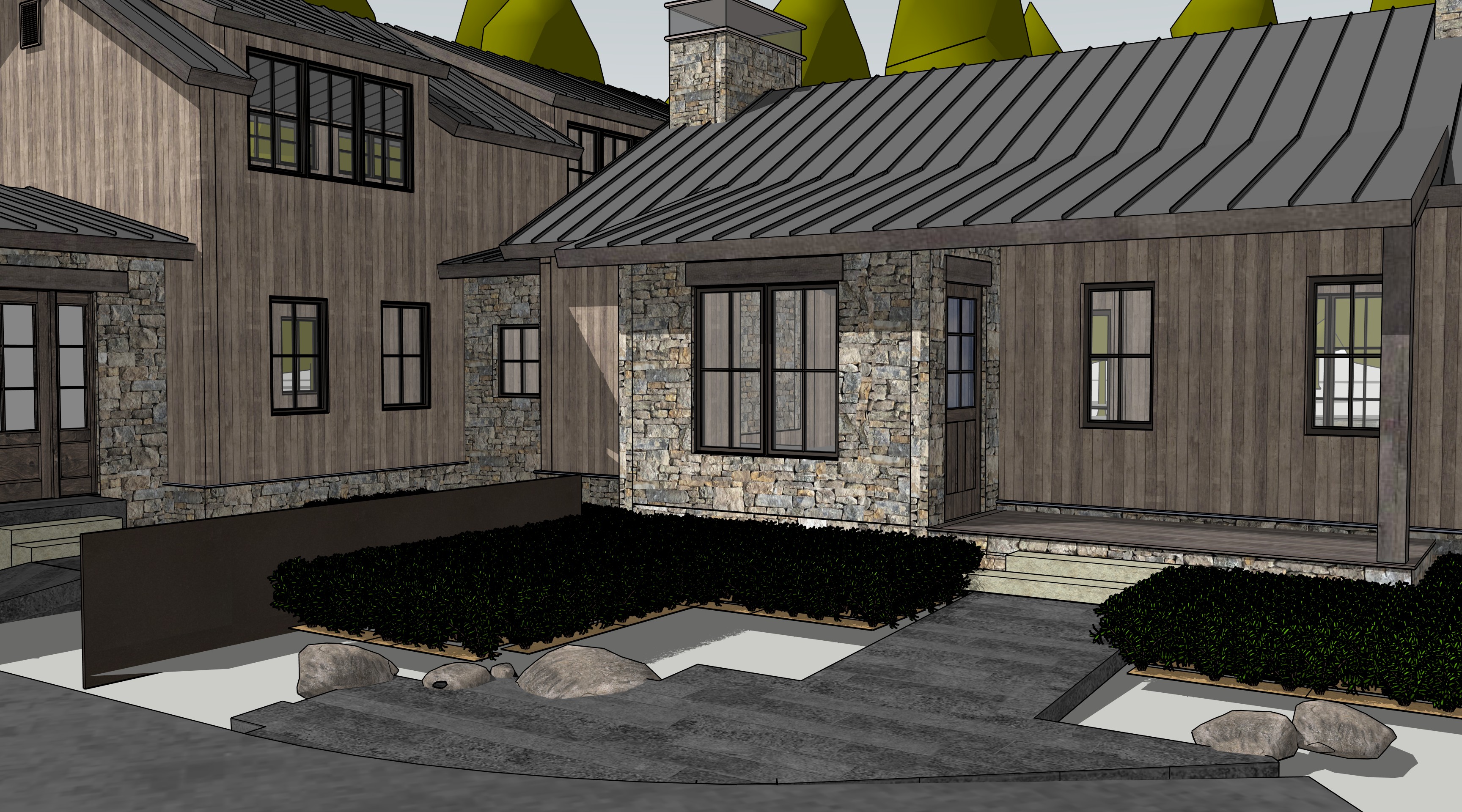 render a photorealistic 3d perspective of this house in jackson wyoming reference the current material style just enhance them charcoal standing seam metal roof vertical wood siding stone veneer walls keep model geometry the same windows doors roof walls cut stone walkway to front boardwalk landing where green fill in with lush vegetation around patio spaces that looks native to jackson wyoming asphalt driveway vertical steel charcoal colored panel in landscape do not change the view only enhance the current materials and make the landscape nicer vegetation detailed textures in the wood siding and glass reflections and a vibrant clear sky with light atmospheric depth render in hyper realistic architectural visualization quality 8k resolution