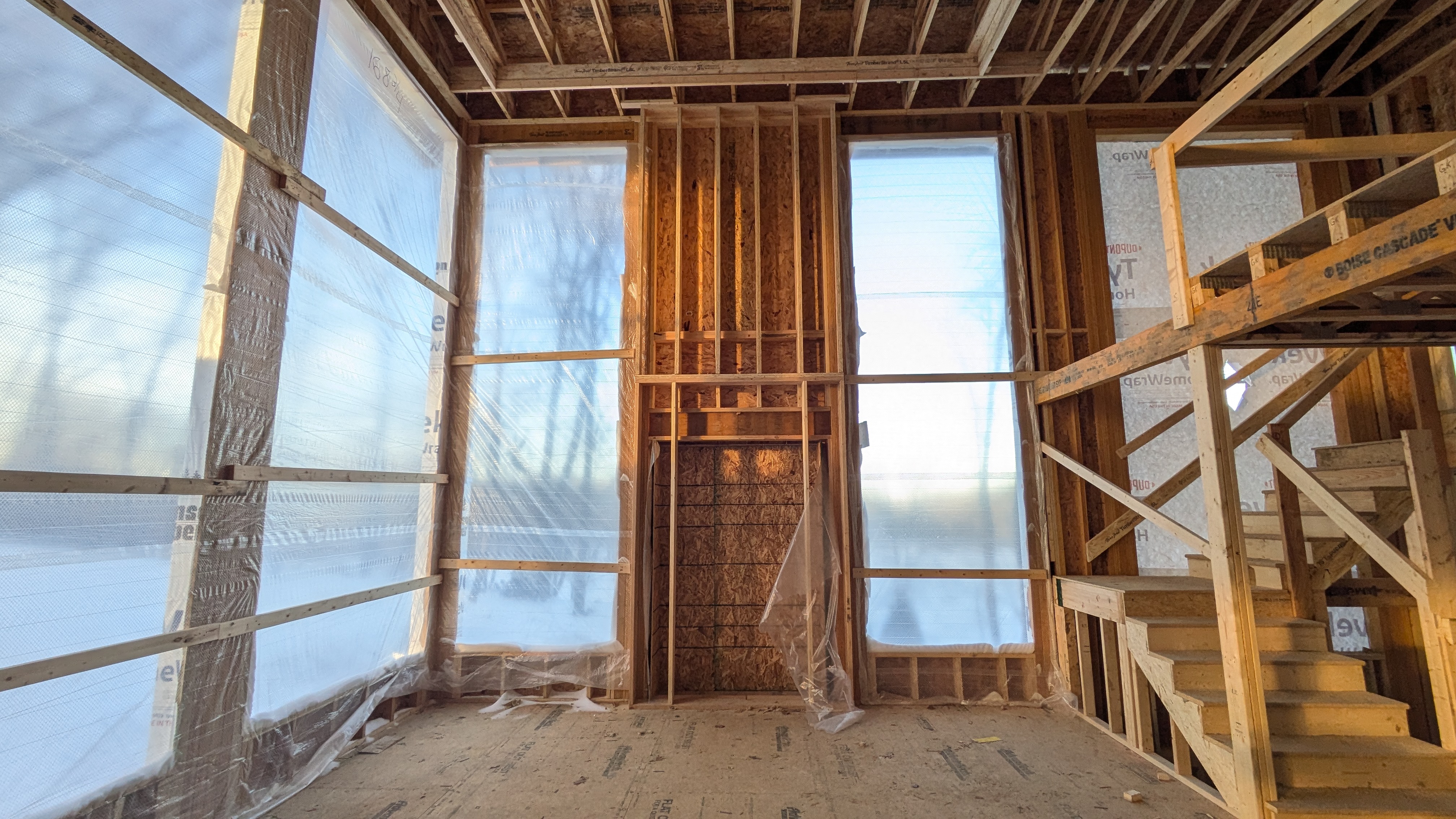 there is a large gas fireplace in between very large tall windows with black outer frames but no center mullions that overlook wooded nature minimalistic and modern furniture design would accommodate this rustic natural modern atmosphere