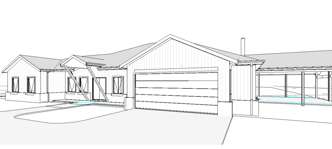 this is modern farmhouse with charcoal colorbond sheeting it house a charcoal sectional double garage door there is 2 structural timber columns at angle the carry the roof the rest of the house house a black scyon axon cladding band round the house at 700mm high with white vertical slatted weatherboard the alfresco on the right hand side don t have any windows and timber beams and columns