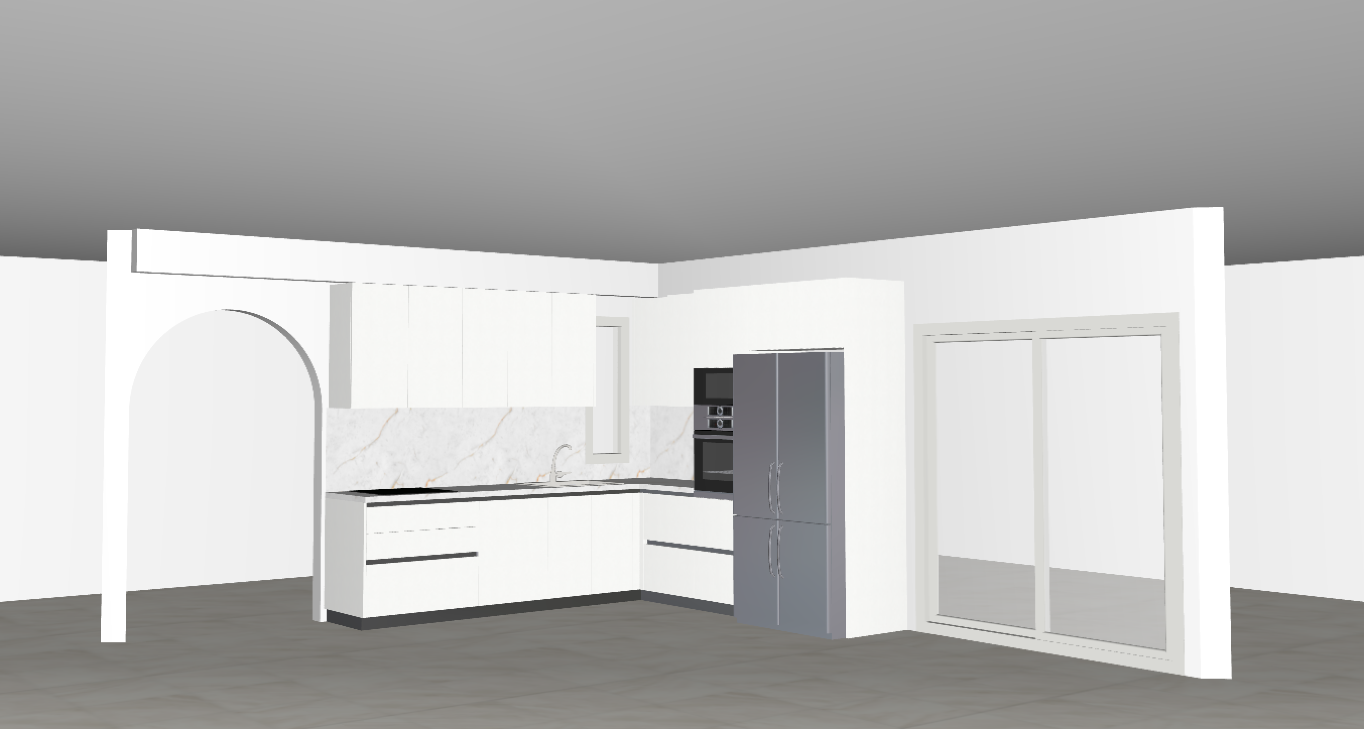 render a modern kitchen with an elegant and minimalistic atmosphere use soft white for the walls ensuring a clean and bright environment the cabinets should be a sleek glossy white to emphasize modernity incorporate a marble backsplash with subtle gray veining the countertop should be a light gray stone adding sophistication the refrigerator and oven should be stainless steel with a slight reflection for a polished look the floor should be a light gray tile with a matte finish ensure there is soft natural lighting coming from a large sliding glass door adding warmth and inviting harmony into the space