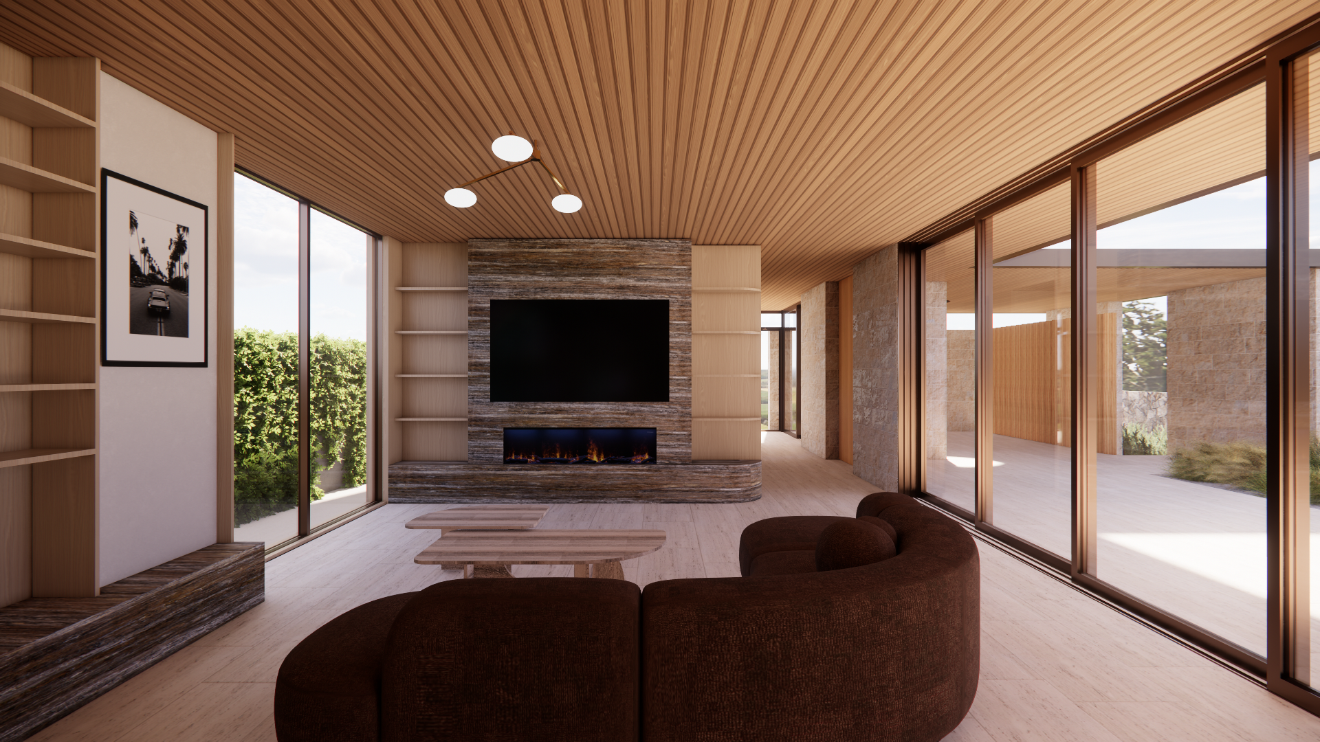 transform into a high end hyper realistic visualisation keep the view the same same walls same window don t make floors shiny add detailed textures and reflections change fireplace stone to honed chocolate travertine add textured cream rug under coffee table