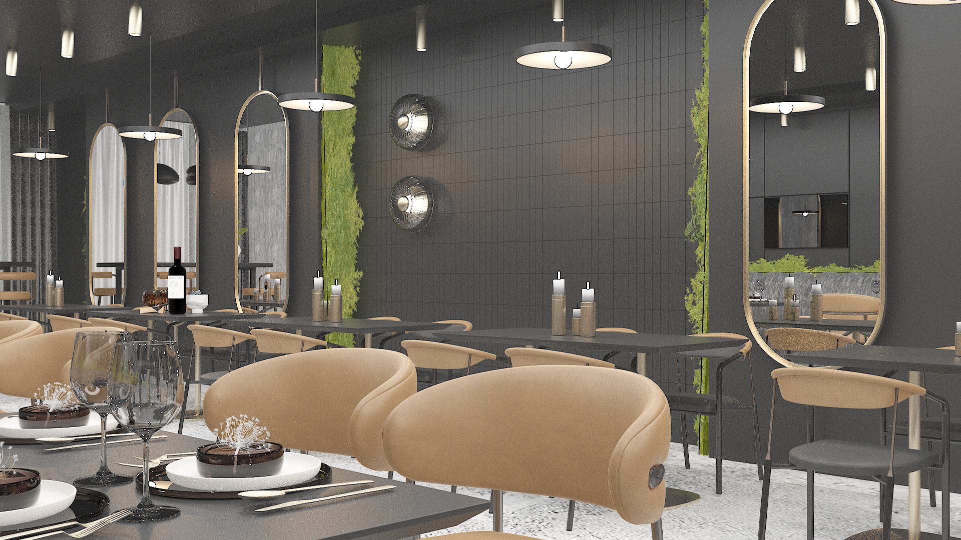 put hyper realistic black stone tiles on the wall between two green vertical and behind wall lamps