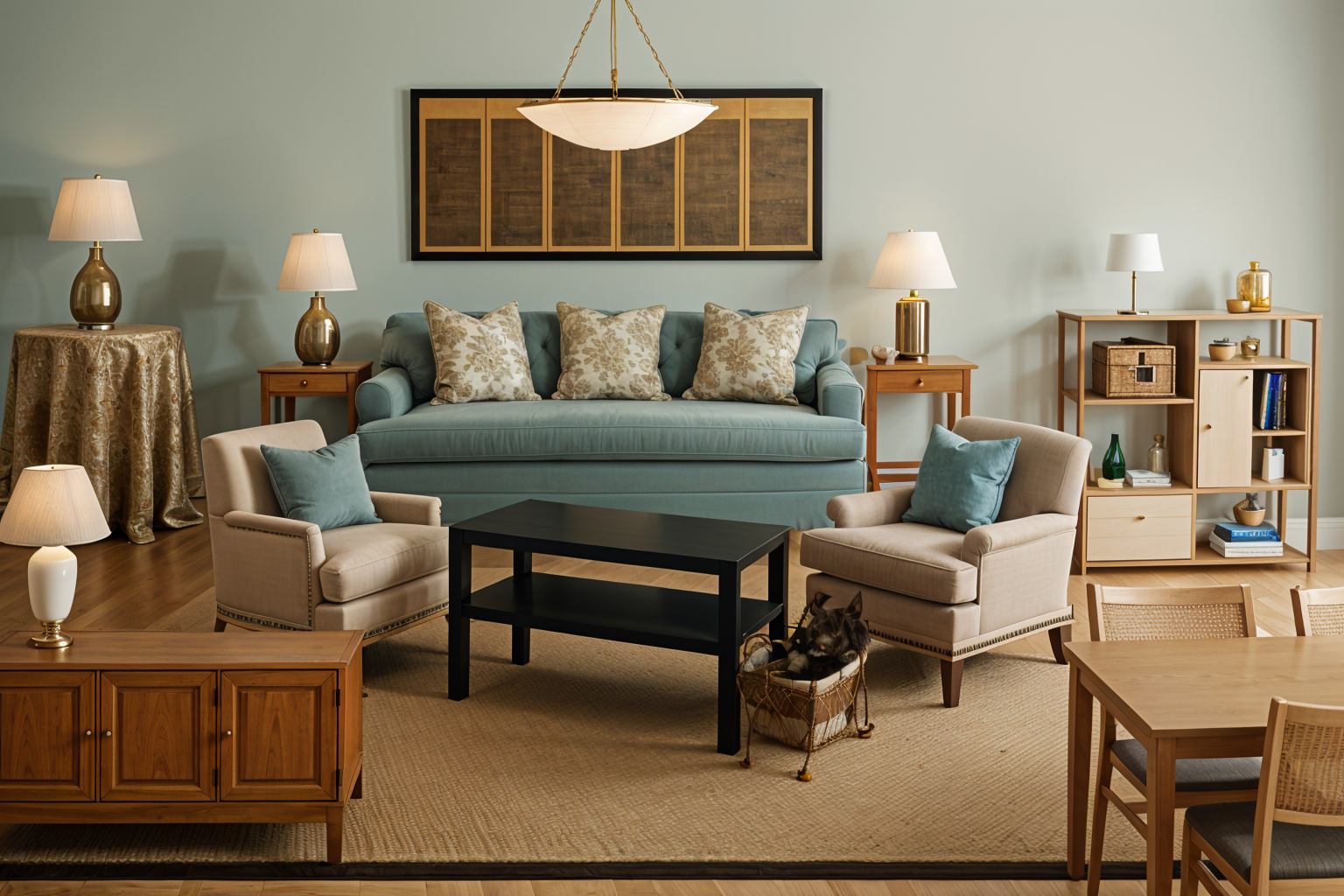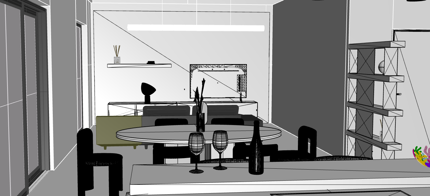modern open plan living and dining area minimalist interior design neutral color palette with shades of gray and white oval dining table with calacatta marble top and triangular legs in reflective mirror material fabric chairs with blue fabric frame amia model by miniforms beige fabric sofa with yellow cushions beige low cabinet with glossy lacquered finish and glass legs dark beige shelf taccia model lamp by flos with black base and transparent and white lampshade fixtures with light gray profile decorative vase centerpiece contemporary shelving unit with cross braces built in wall shelf with minimal decor sleek linear pendant light gray sofa in background facing a flat screen tv glass sliding doors on the left ambient daylight from left side clean geometric lines architectural wireframe style visualization eye level perspective spacious and functional layout