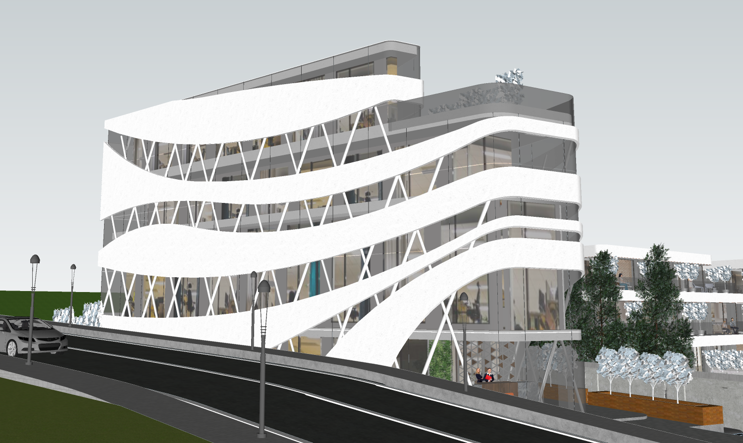 the trees are not white please turn them green put some hills in the background and a few low floors contemporary buildings the sky dynamic
