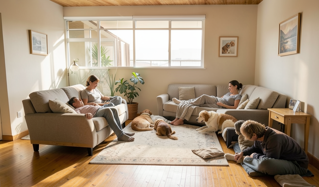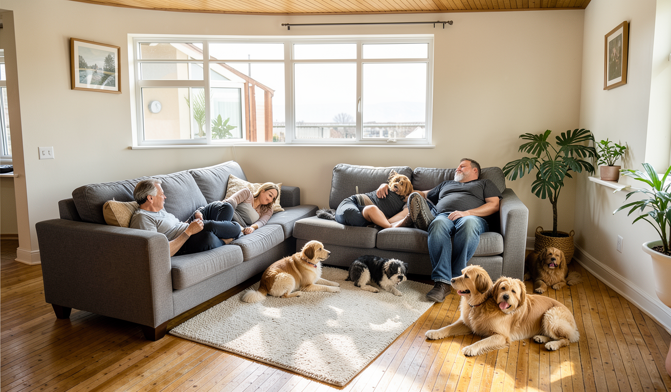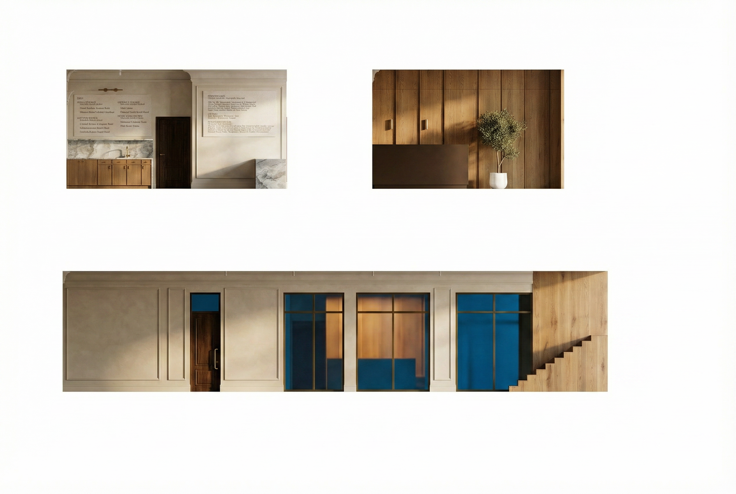 render a charming rustic house with a symmetrical fa ade use light grey board and batten siding above a 2 coffeyville style wainscot use black accents for the window frames trim and soffit the roof should be a weathered black complementing the light stonework at the base highlight the front door with a deep inviting mahogany and adorn with quaint lantern style lights in wrought iron the garage doors should have a rich black finish place the house in a serene countryside setting with a soft golden sunset illuminating the landscape creating a peaceful and welcoming atmosphere do not modify the structure