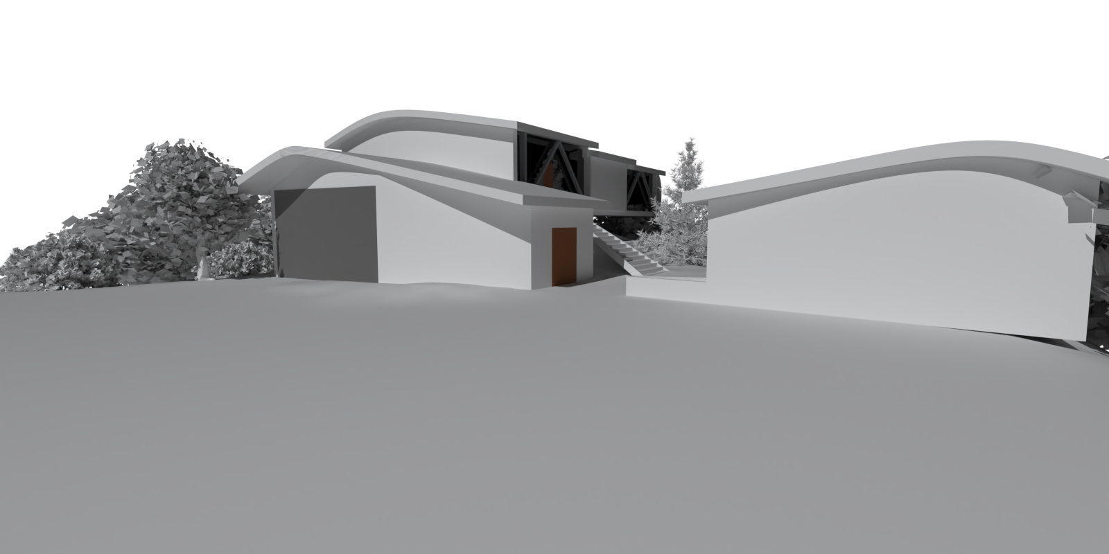 render the buildings in this image with soft textures the roofs are textured corrugated metal the walls are light wood like a cabin render the image so it architectural dimension overlay make it look like a technical sketch with loose watercolor washes and white paper soft unfinished fade around edges