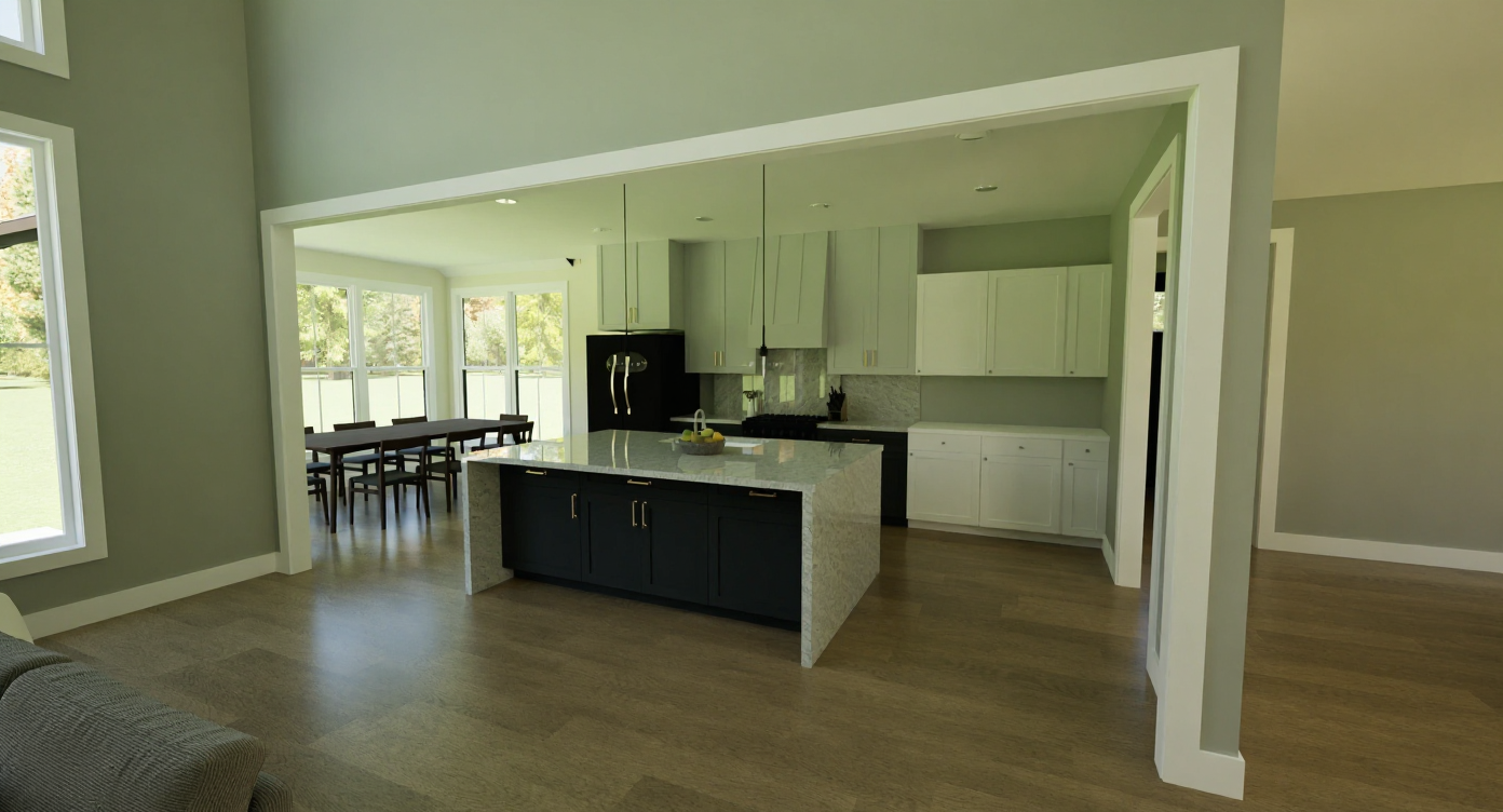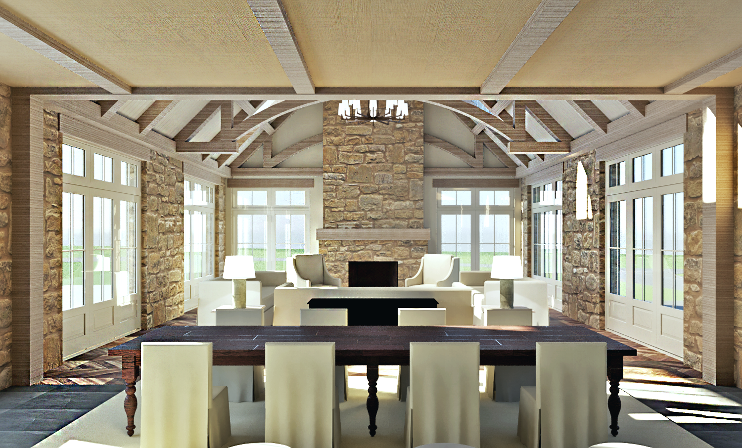 dining room and living room retain existing architecture neutral grasscloth ceiling in foreground rough hewn wood beams irregular stone tile flooring in foreground midwest northwoods outside