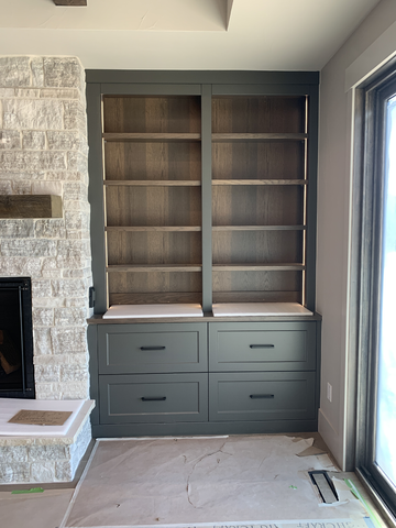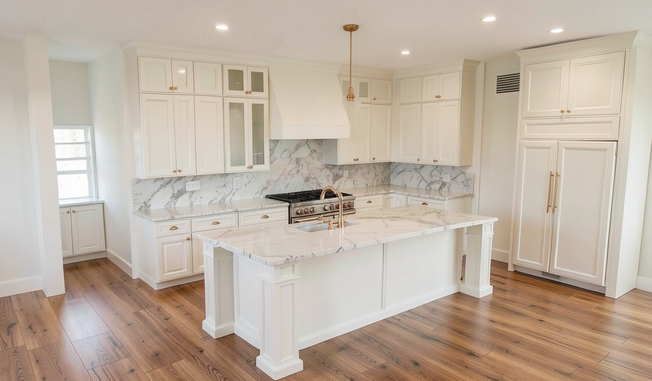 do not change the cabinets in any way preserve the exact cabinet colors materials finishes dimensions door and drawer styles hardware spacing alignment and all geometry exactly as shown do not alter the countertop shape backsplash appliances flooring lighting fixtures or wall structure only remove the construction materials clutter and mess from the scene clean the room and make it look finished and staged add a few simple tasteful home accessories appropriate for the style of the space but do not add or remove any furniture windows or architectural elements maintain the original lighting direction and realism enhance clarity and polish the photo while keeping the cabinetry and room design completely unchanged do not alter the lighting to keep the cabinet colors as they are in the image remove the white boards on the countertop stage the shelves for a simplistic modern living room