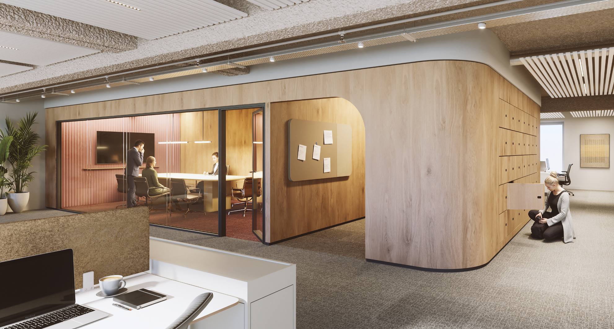 exterior shot change color of the closed meeting space where the wall and floor have orange tone change the wall of the closed space to green ribbed acoustic panels and the floor of the closed space in this green carpet the open office space keep it untouched tambien cambia el suelo naranja por la alfombre verde el suelo gris se deja igual