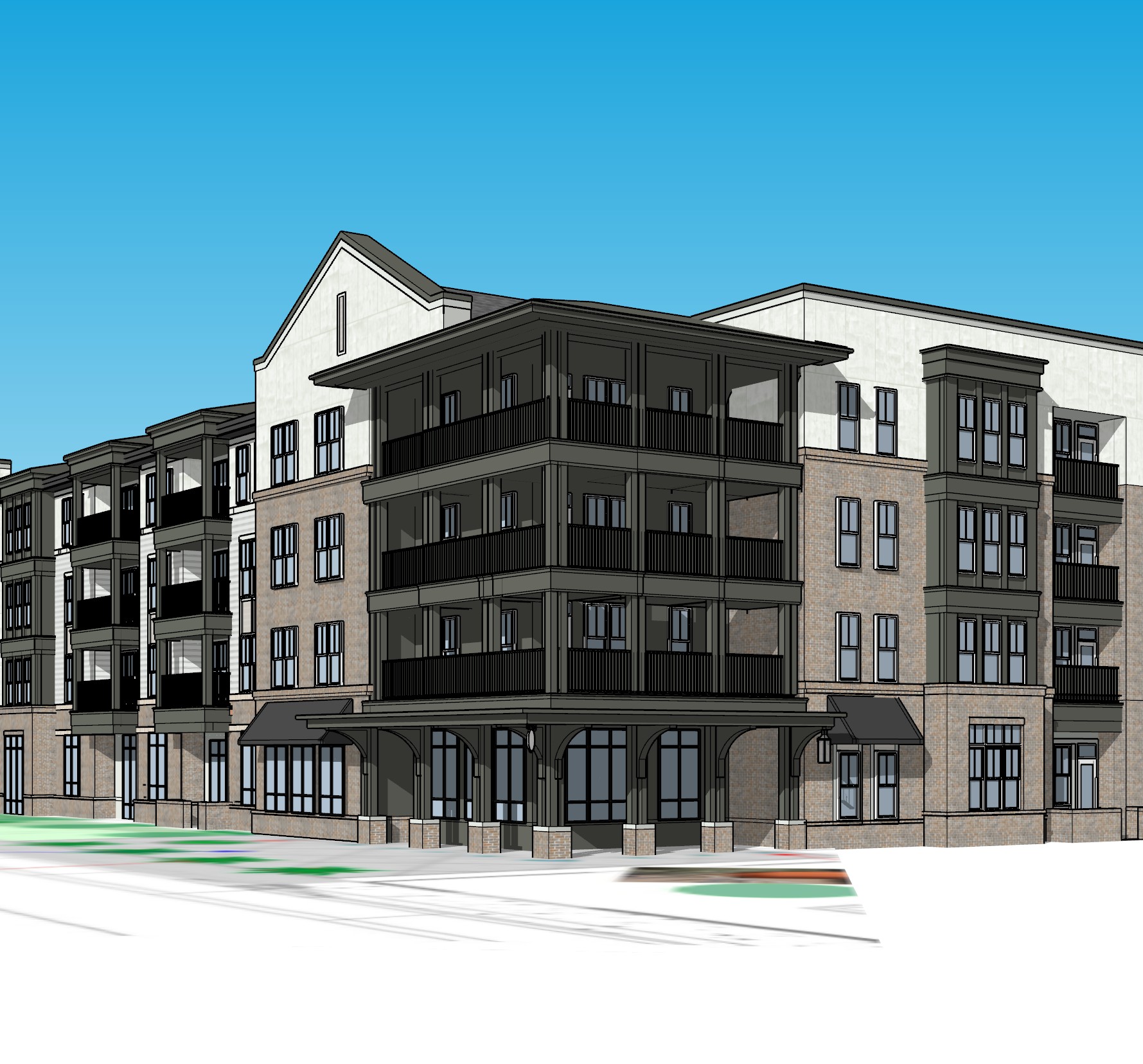 daytime view with white brick white stucco and dark gray trim black windows
