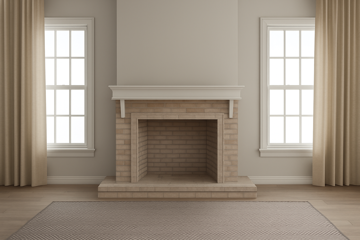 make the curtains a striped linen per the reference photo extend the mantle make flooring a dark slightly greyed timber that appears rustic beaten and waxed per the reference photo remove the rug keep the view centred