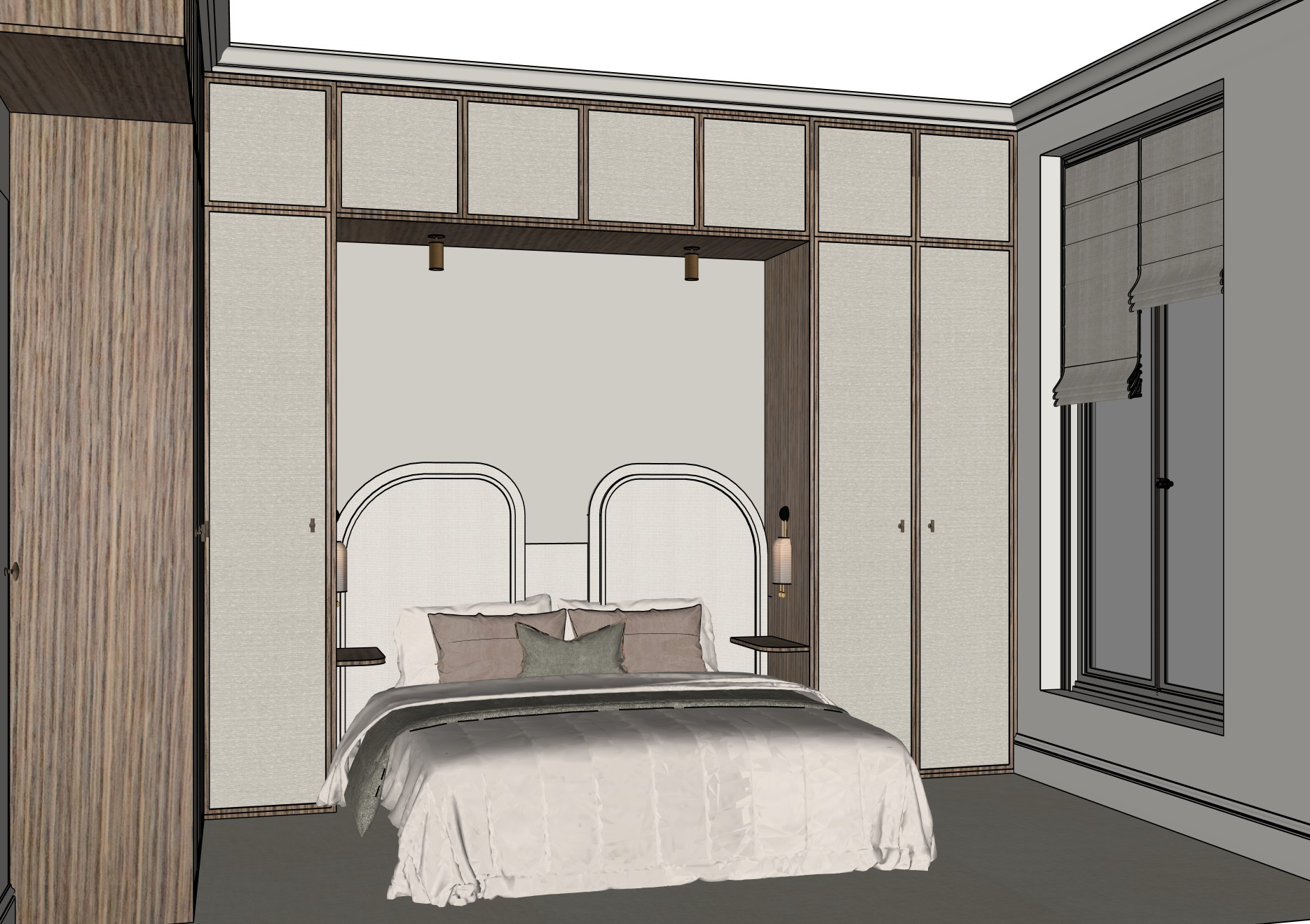 the apartment is on the 3rd floor of a parisian building the walls are in light greige on the floor there is an off white carpet covering all of it the wooden frame is in this wood https www ober surfaces com fr oberflex essences fines noyer d amerique t266 html