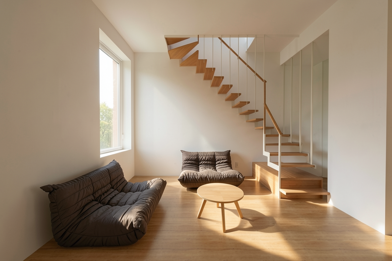 spatiul gol din mijloc stanga trebuie sa ramana gol acolo este casa scarii nu avem ferestre la canapeaua centrala circulara pe stalp materialitatea este de piele camel la fel ca si canapeaua din stanga stalpului