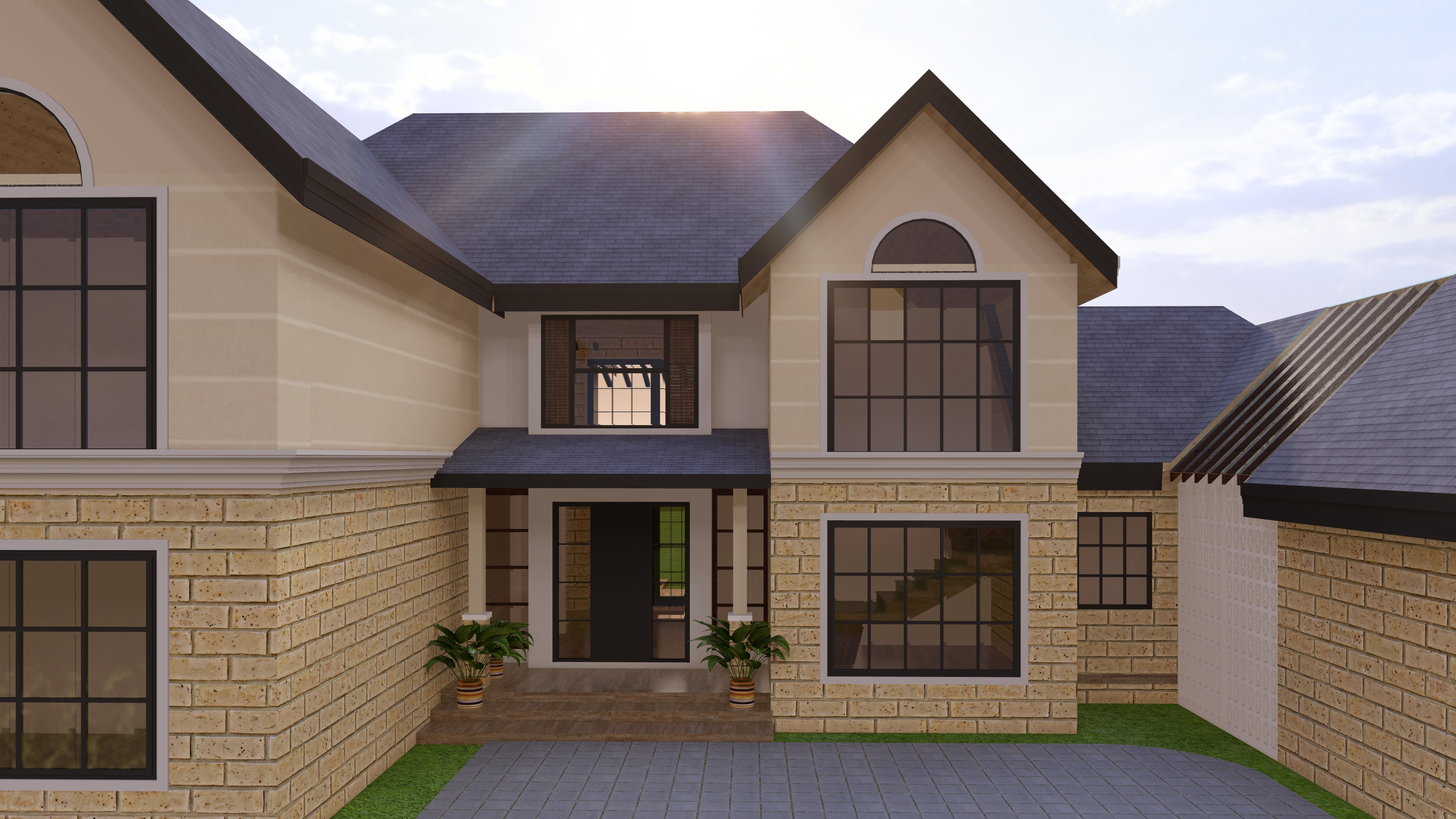 model of a house add few trees in background to give it context add very very few vegetation with some floral ones i want a sunsety 3 4 p m vibe make the horizontal lines on upper walls beidge and very thin they should only be 3 of them