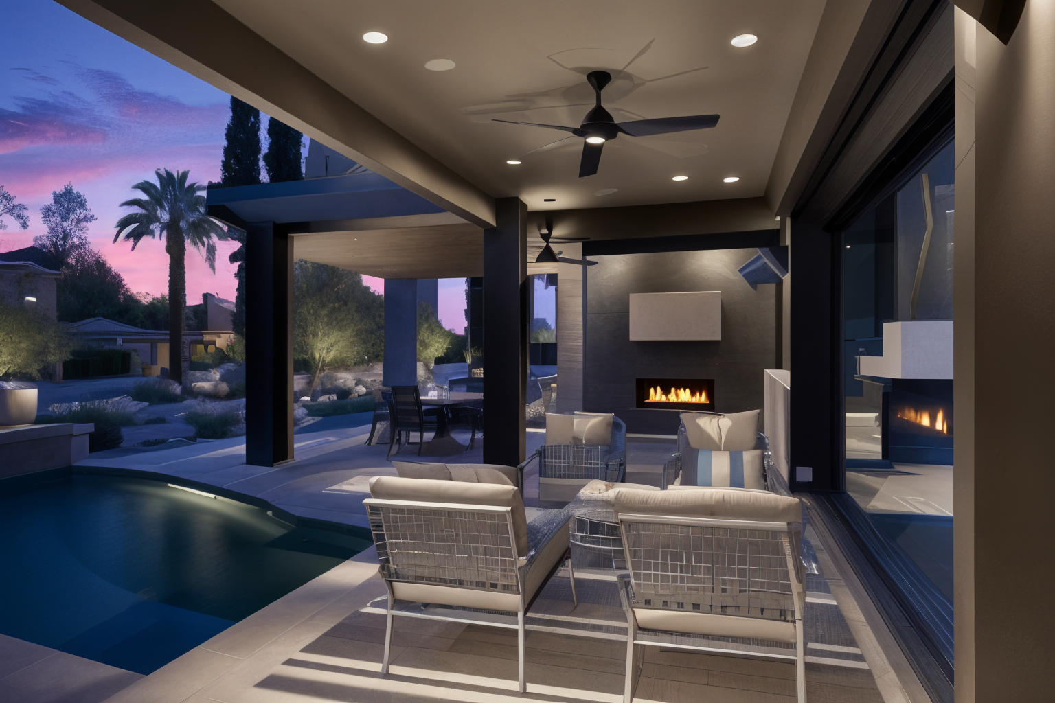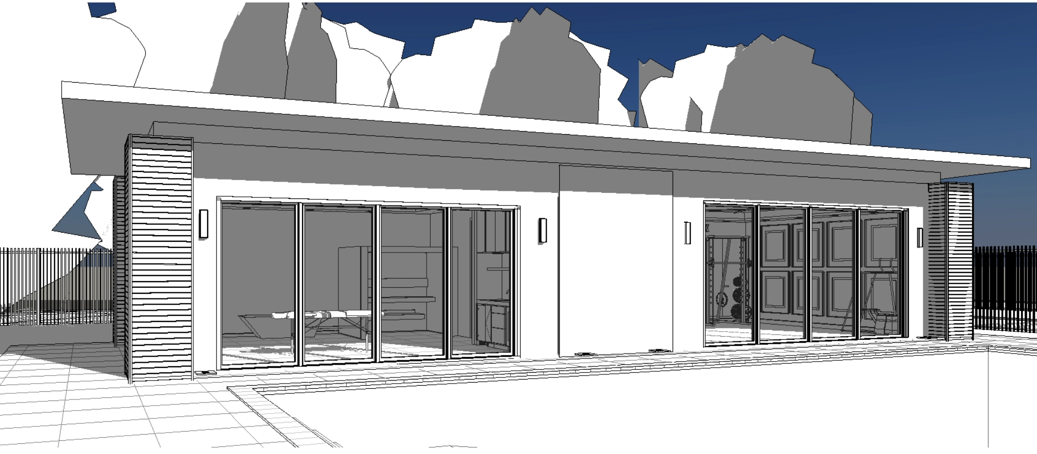 modern exterior shot modern exterior shot modern exterior shot modern exterior shot black and concrete building with black roof private reflective windows rectangular pool and fire pit in center black fences lush tropical greenery in background grass and smooth porcelain floor architecture architecture architecture