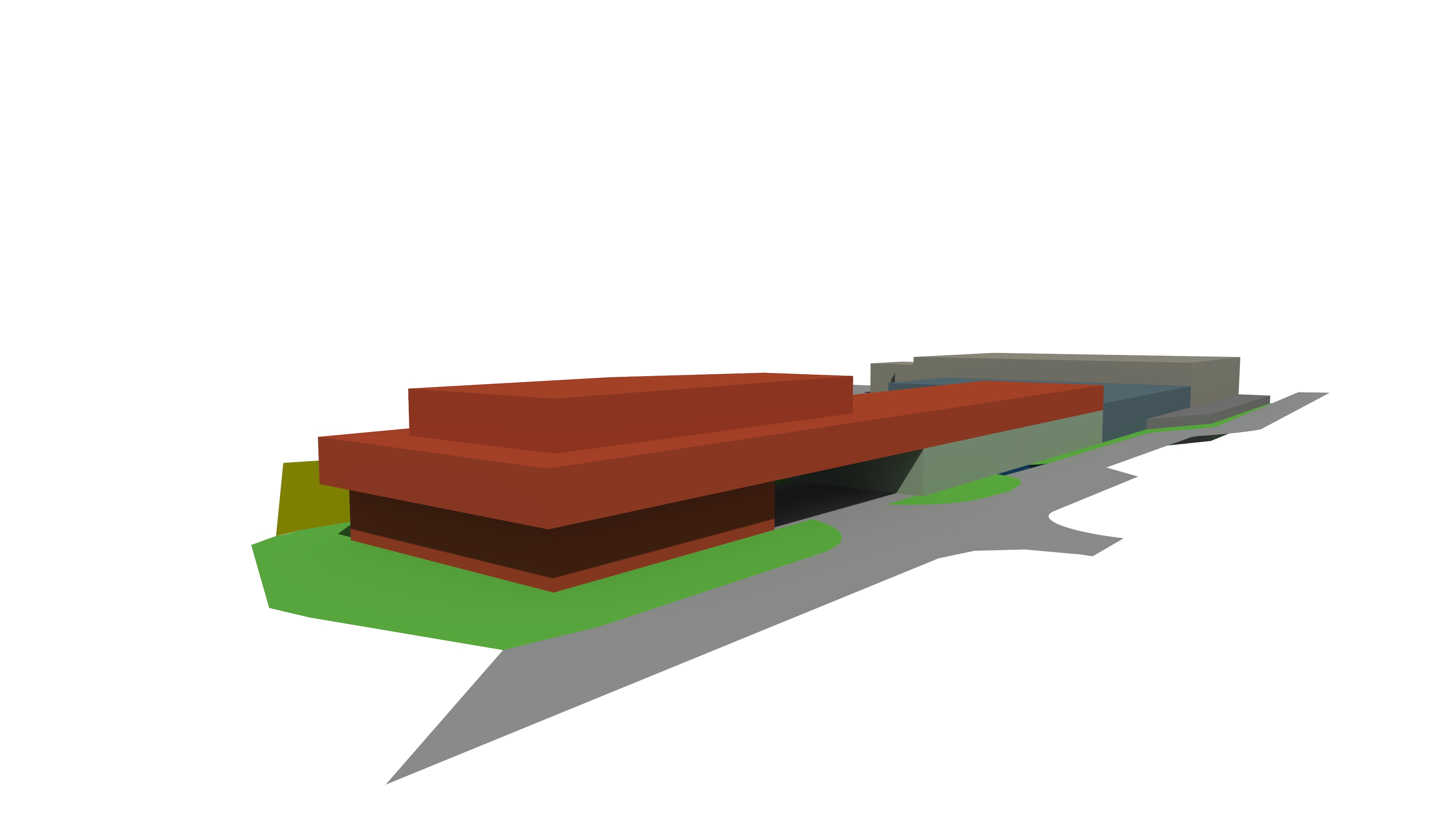 exterior shot create a visualization with an office building and warehouses the red cube should be the office building in front of the office building there should be plants trees and grass the light green cube below it should be a sales area with lots of glass behind the blue and gray cubes are warehouses clad with sandwich panels the building should have a green roof add cars and trucks