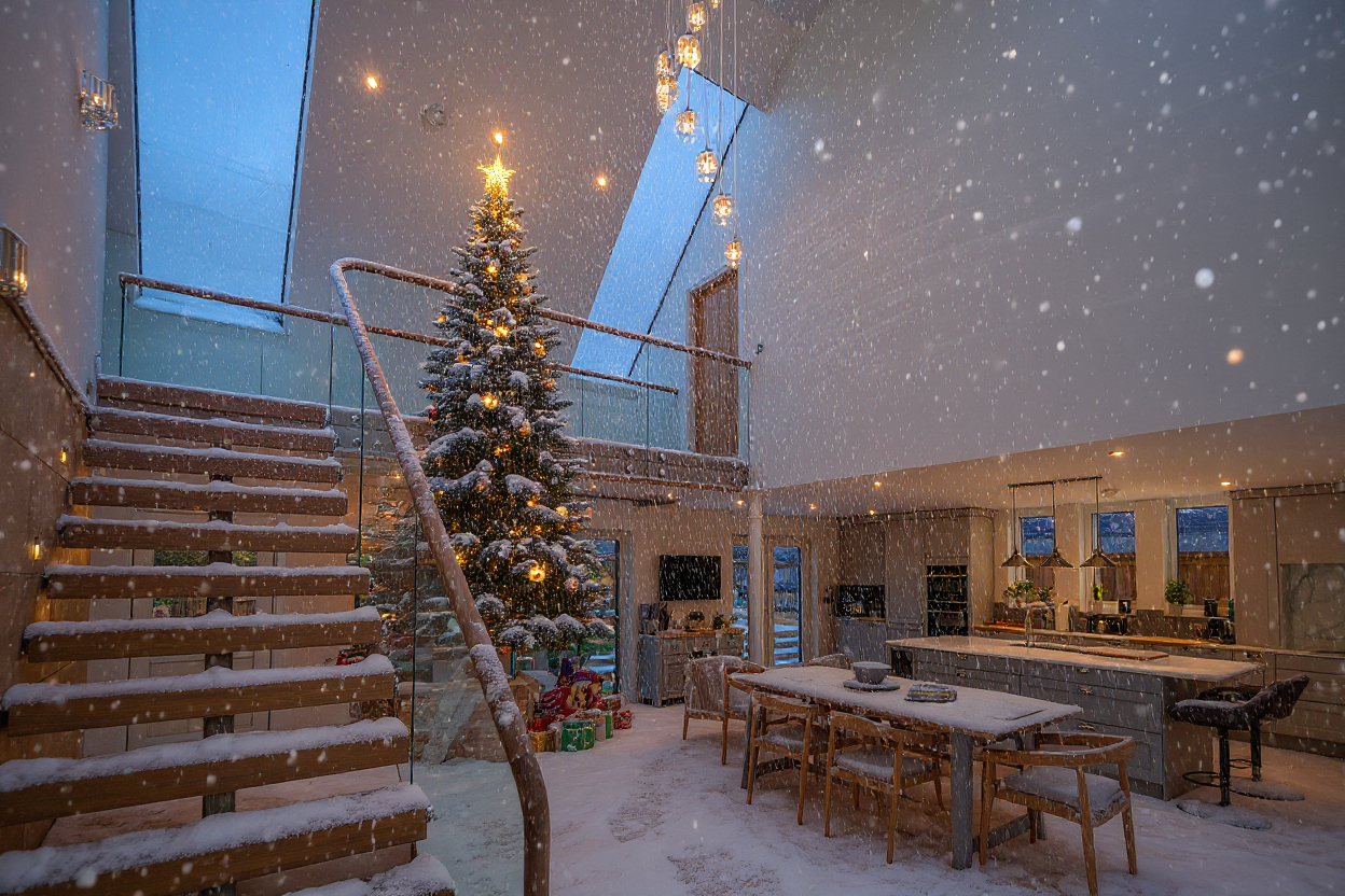 keep the existing architecture room layout staircase glass balustrade kitchen arrangement lighting windows and overall structure exactly the same preserve the central christmas tree snow covered interior and existing festive atmosphere add small friendly elves dressed in green and red doing playful activities around the room such as peeking from behind the tree sitting on the stairs or interacting with gifts include a couple of cute curious and adorable penguins on the snow covered floor near the dining area or by the windows add a cheerful snowman with a scarf carrot nose and twig arms positioned outdoors just beyond the windows or in a snowy corner where it fits naturally without altering the architecture maintain the same lighting snowfall and perspective while enhancing the playful holiday mood