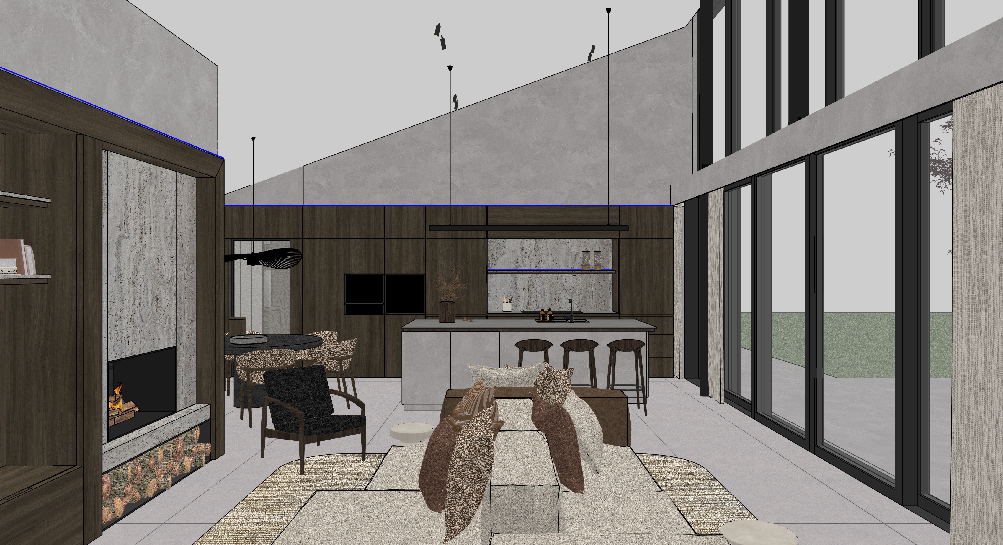 create a high end architectural interior realistic render calm and refined atmosphere soft natural daylight neutral warm palette balanced tones no orange cast diffused light with soft shadows subtle contrast natural color accuracy emphasis on materiality and texture tactile surfaces minimal styling clean architectural lines integrated design serene and timeless space depth and layering cinematic softness slightly desaturated tones photorealistic 35mm lens soft color grading quiet luxury emotional balance breathing space no harsh lighting no strong color cast no oversaturation maintain 100 of the geometry materials colours and layout with a sharp photorealistic result add more natural daylight most important materials concrete stucco grey areas warm grey ceramic tiles 90 x 90 cm open pore travertine titanium carpentry dark oak kitchen countertop inox kitchen island concrete stucco back wall kitchen travertine open pore keep the details in the island base concrete stucco wood detail inox counter add light in the spots in the ceiling indirect light indicated blue lines replace this by led add some minimalist decoration where necessary not too much ceiling matt white add a great outdoor view garden at the right belgian garden but its a clear day make it look very architectural add the windows on the left side but keep the column